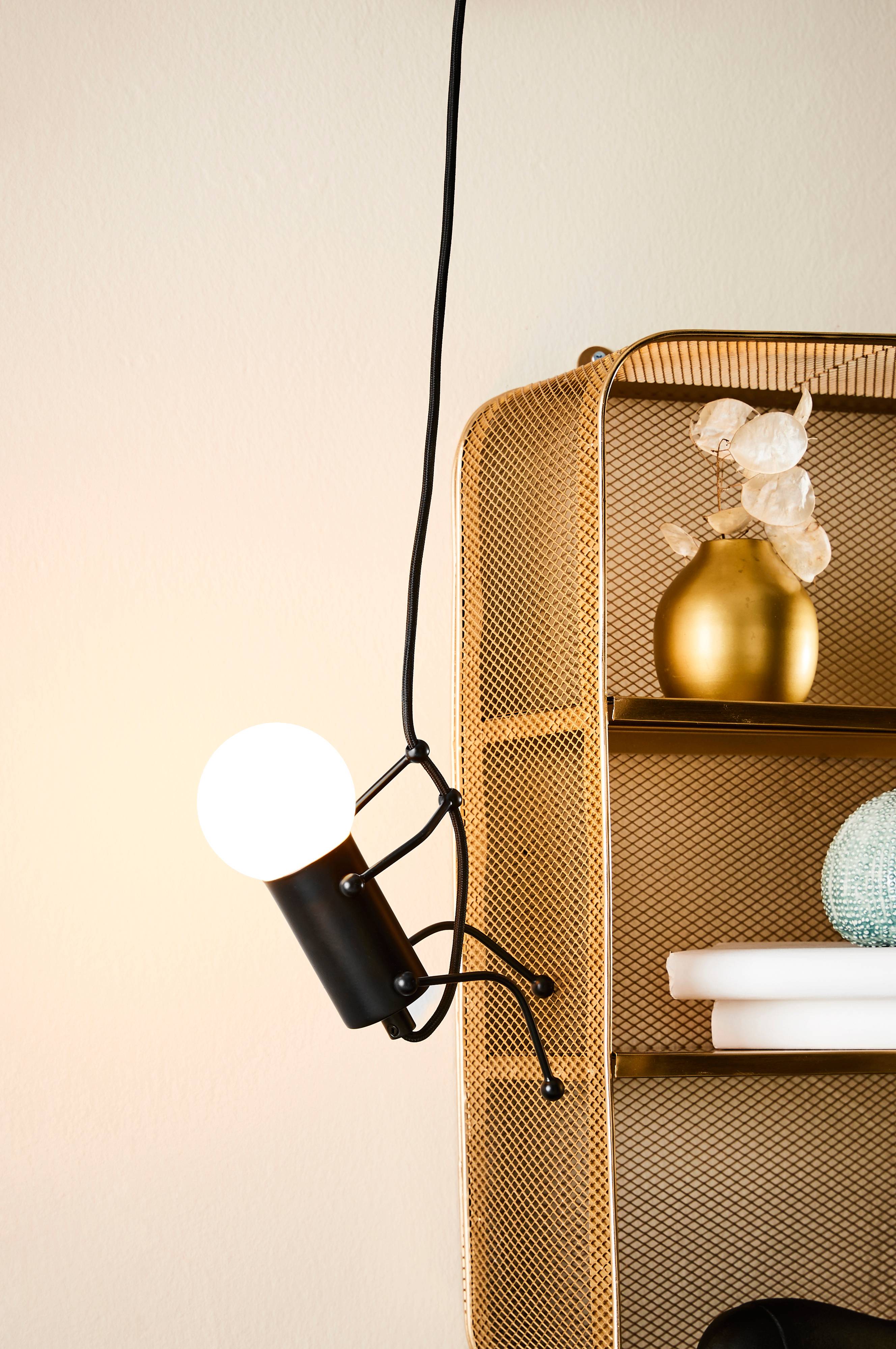 Fin lampe i metall. En svart fantasifigur klatrer opp på den svarte tekstilledningen. Lyskilden kan forandre lampen avhengig av hvilken pære du velger. Ledningslengde 3,5 m.