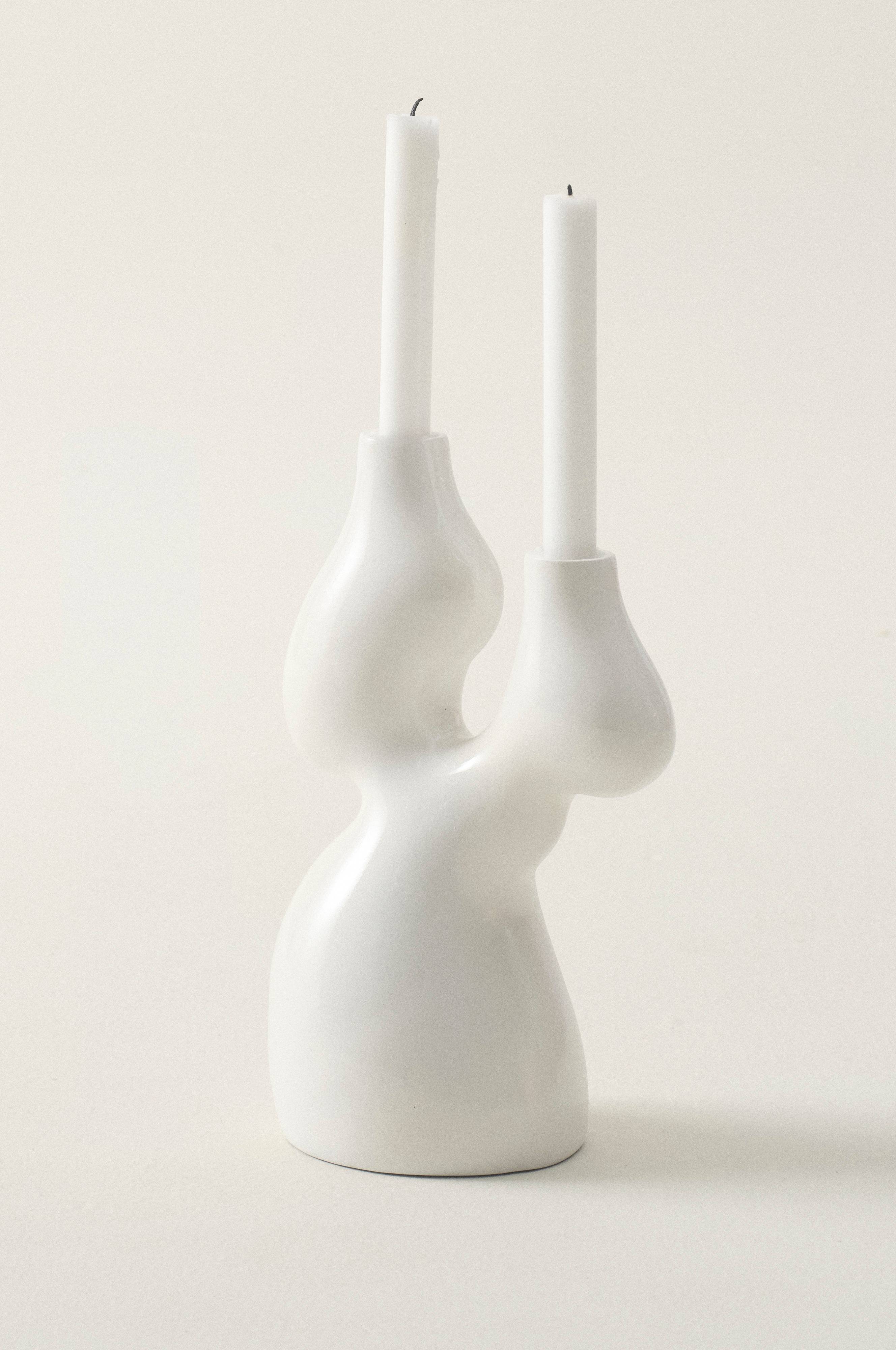 Håndlaget lysestake av polyresin. Lysestaken er myk og bølgende i formen, og har to lysholdere. Det fine håndverket gjør hver lysestake unik. Lys medfølger ikke.