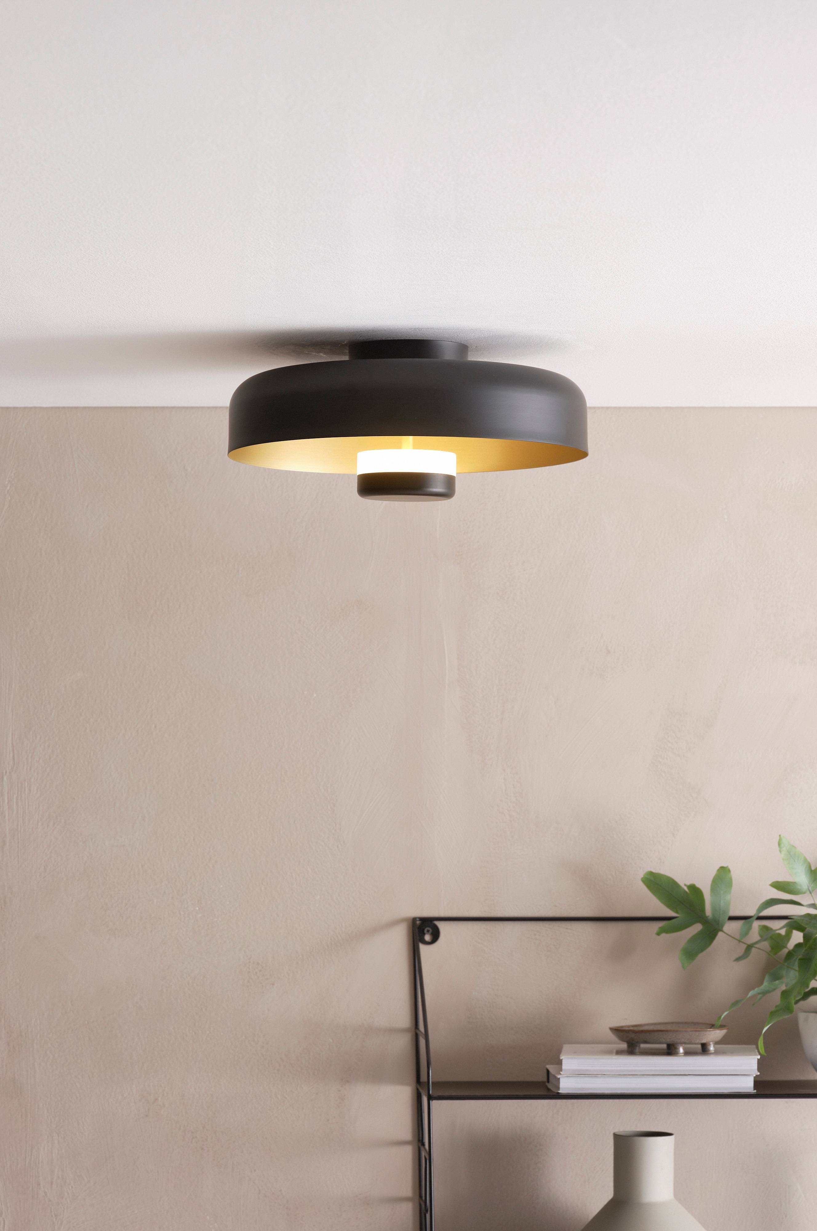 Takplafond av svartfarget metall. HENDRIX er en moderne takplafond i nedtonet design med svart skjerm og gullfarget innside. Takkontakt inngår ikke pga. nye EU-regler. Den kan kjøpes separat, og heter ROOF EARTH takkontakt.