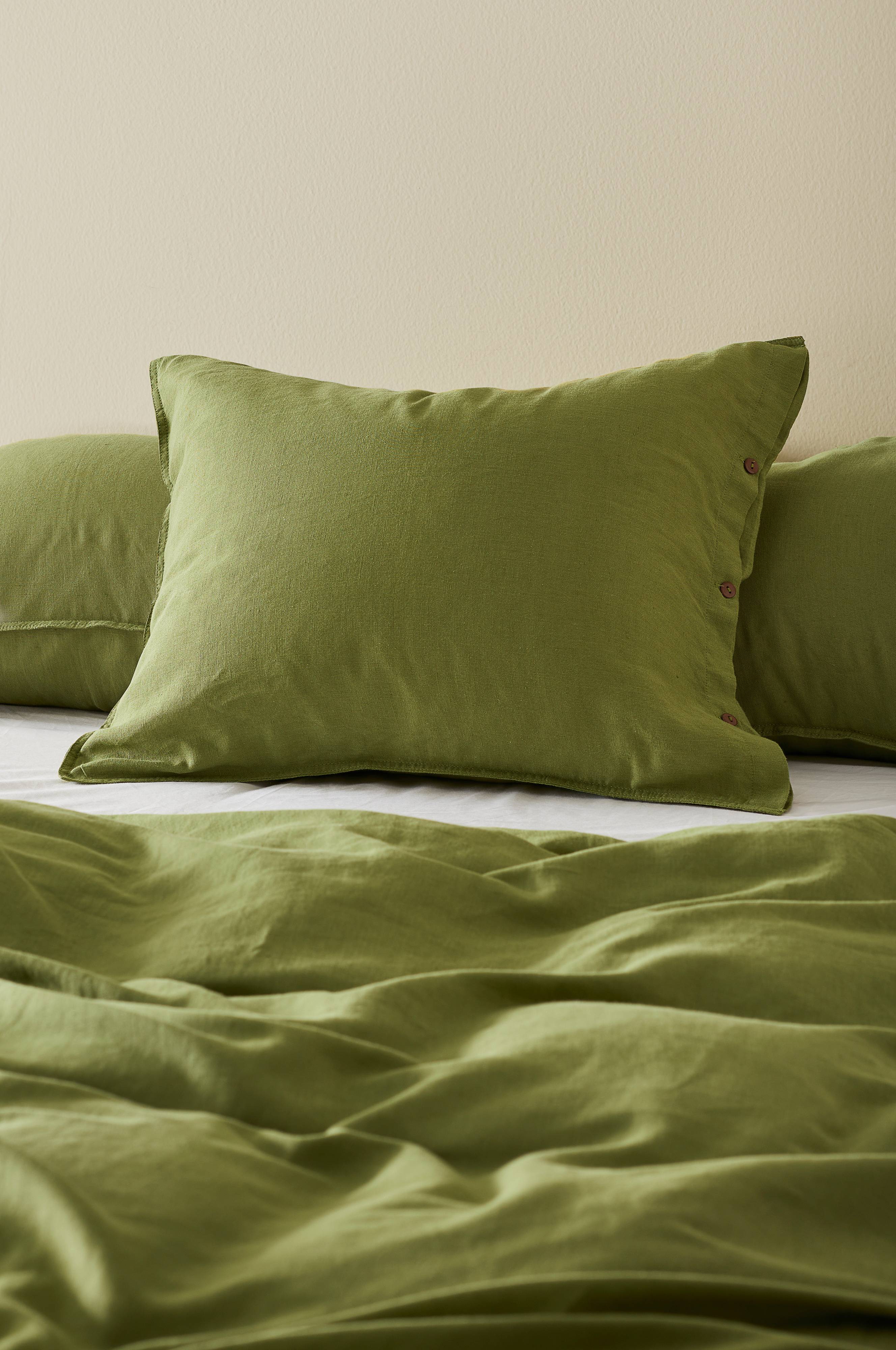 1-pk putevar av plaggvasket lin- og bomullsblanding. Dobbeltsømmer og knapper for lukking. Trådtetthet på 92 tc. (Trådtettheten forteller om antallet tråder, thread counts, pr. kvadrattomme i et stoff. Jo høyere trådtetthet, desto høyere kvalitet. Lin og linblanding blir ofte vevd litt løsere for å få den riktige følelsen.)