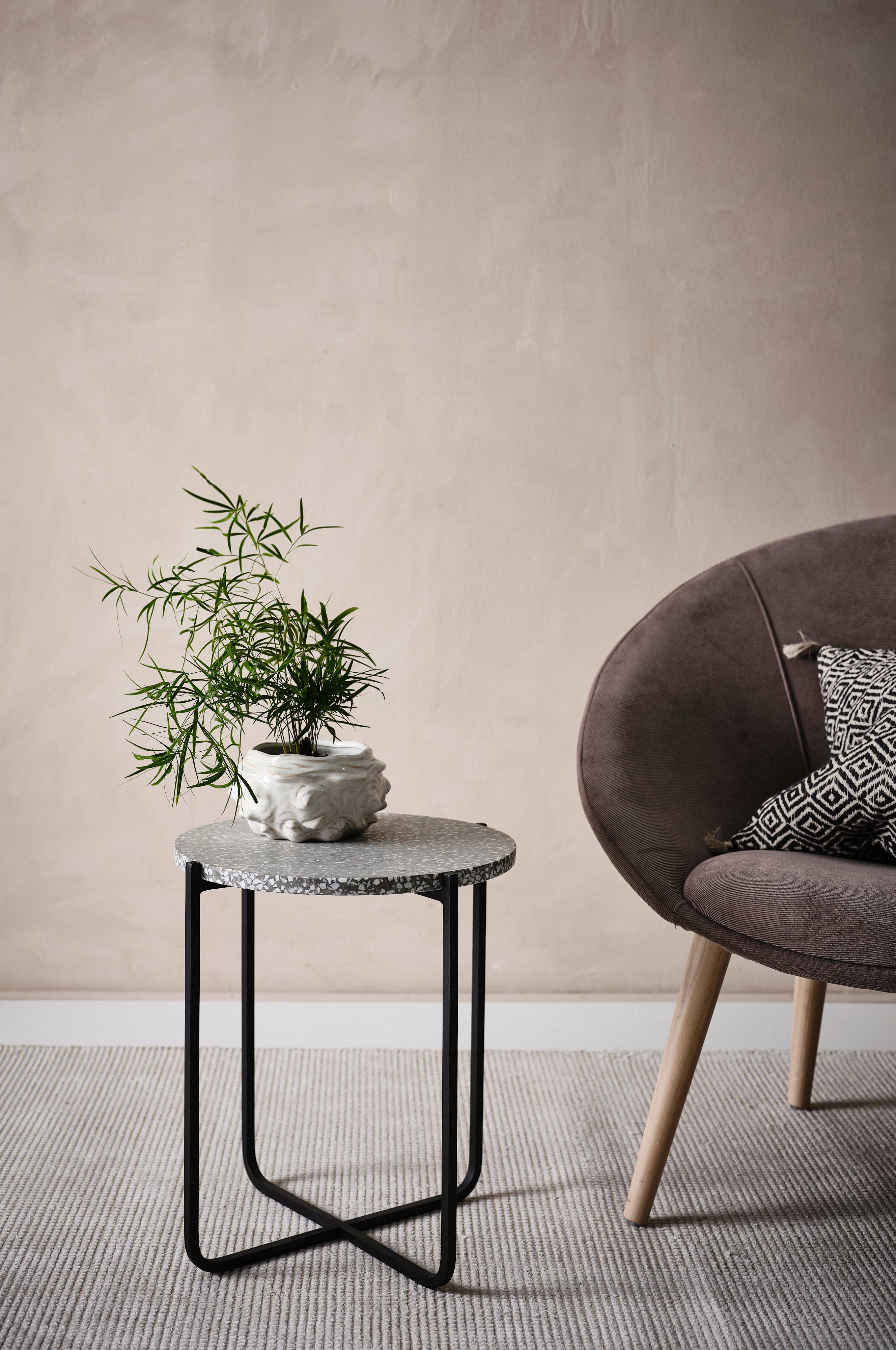 Det runde sidebordet HEYWOOD har en vakker bordplate av terrazzo og understell av pulverlakkert metall med matt overflate. De to materialene står i flott kontrast til hverandre. Terrazzo er en steinplate med base av betong som blandes med knust naturstein av ulike slag. Blandingen av naturstein gjør hver steinplate unik og gjør at den varierer i utseende fra produkt til produkt. Materialet er slitesterkt og har en glatt overflate. Noe montering kreves.