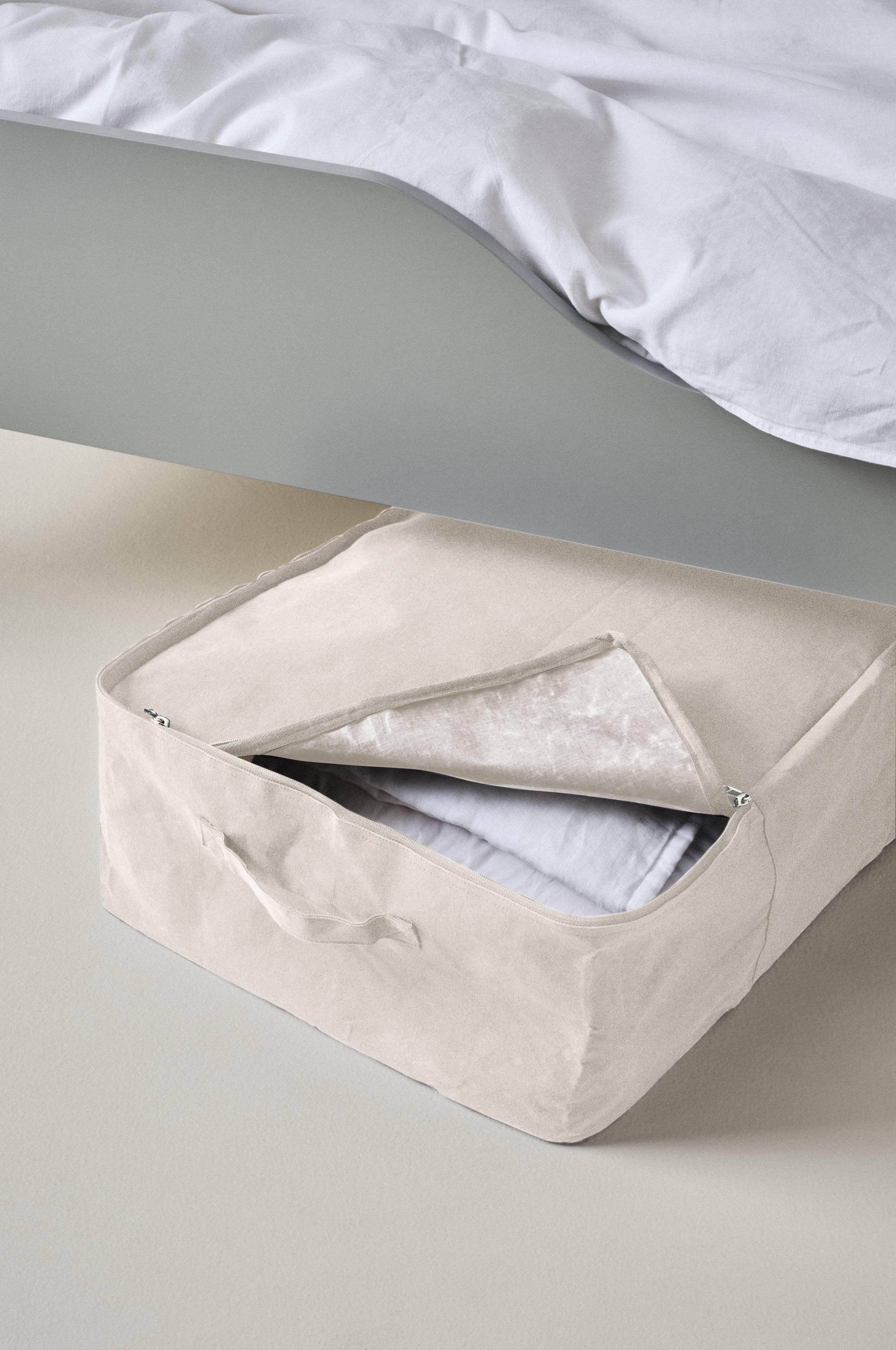 Sengeoppbevaring av bomull med beskyttende laminering av polypropylen. Den firkantede oppbevaringsboksen har glidelås øverst som gjør det enkelt å åpne opp og pakke. Du får dessuten god oversikt over innholdet. Har du dårlig plass, kan HIDING oppbevaringsboks være som skapt for å skyve under sengen - en eller flere. Høyde 20 cm.