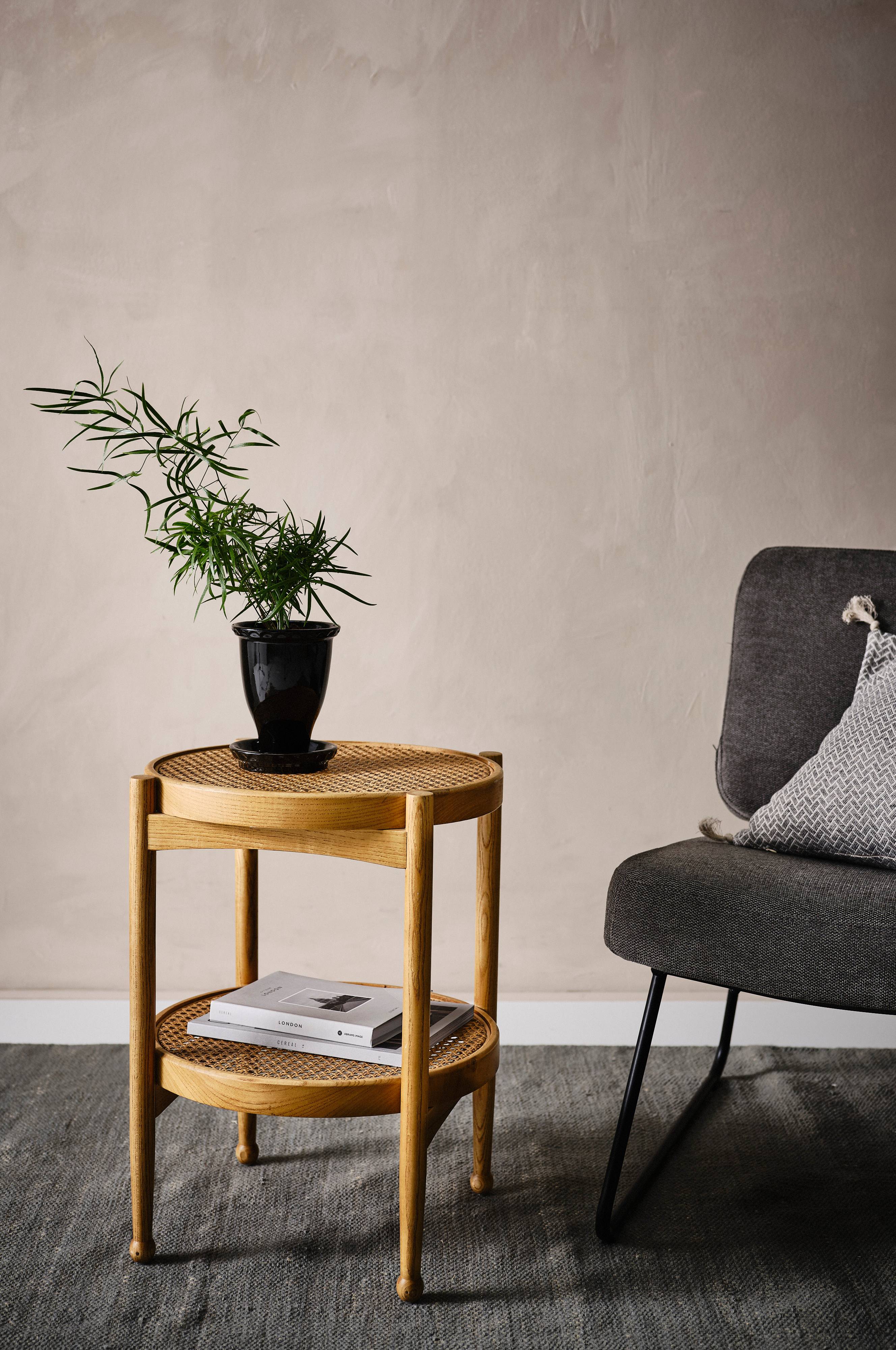Lite, rundt sidebord med bordplate av rotting. Rammen rundt bordplaten og bena er av lys alm eller svartmalt bjørk.