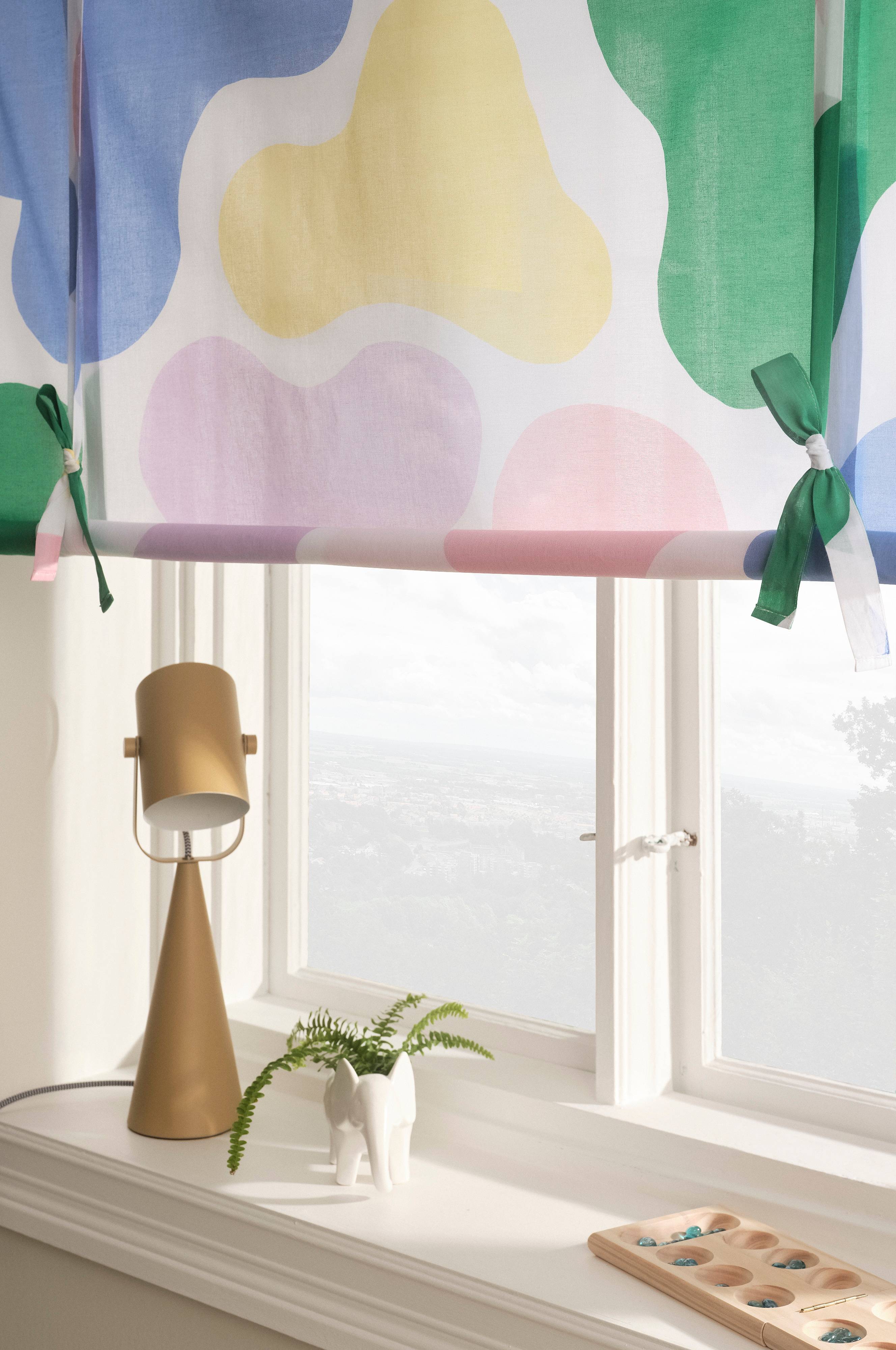 Roll up-gardin av bomull med søtt dyremønster trykt i kvikke pasteller på hvit bunn. Roll up-gardinen henges på vanlig gardinstang. Høyden reguleres med knytebånd.