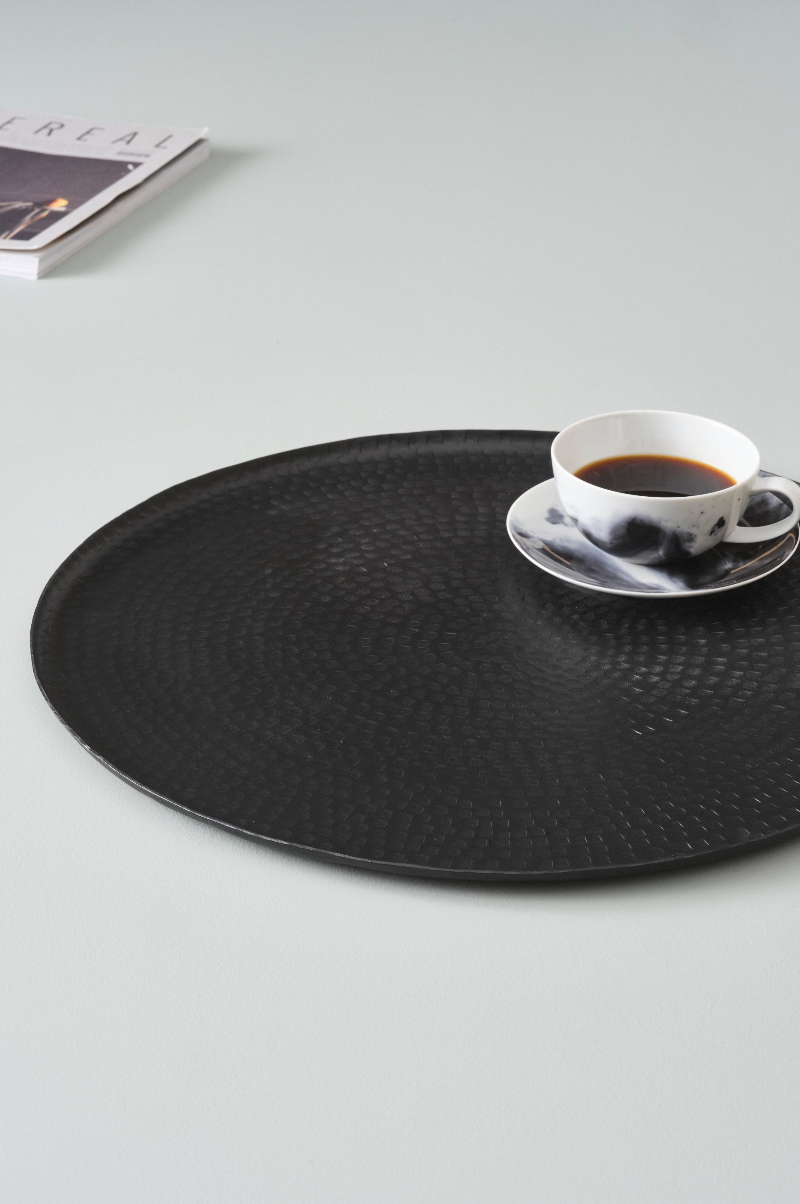 Rundt brett av aluminium, det svarte har pulverlakkert overflate og det gullfargede har tynn plettering. INALI har tekstur som gir følelsen av en hamret overflate og en liten, opphøyd kant rundt. Brettet er like fint til hverdagslunsjen som til festbobler.