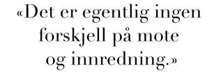 Uansett om man innreder et hotell eller et hjem, vil jeg oppmuntre til å tenke på det som en helhet. Våg å være modig, samle mange ting på ett og samme sted, men la det være igjen en tom flate for restitusjon. Innred for din egen skyld. Hvis du leser bøker, bruk dem som dekor. Hold det levende og hold det anvendelig. Jobb med kontraster; som stort ved siden av lite og tradisjonelt ved siden av noe råere – ekstravagant. Det er egentlig ingen forskjell på̊ mote og innredning.