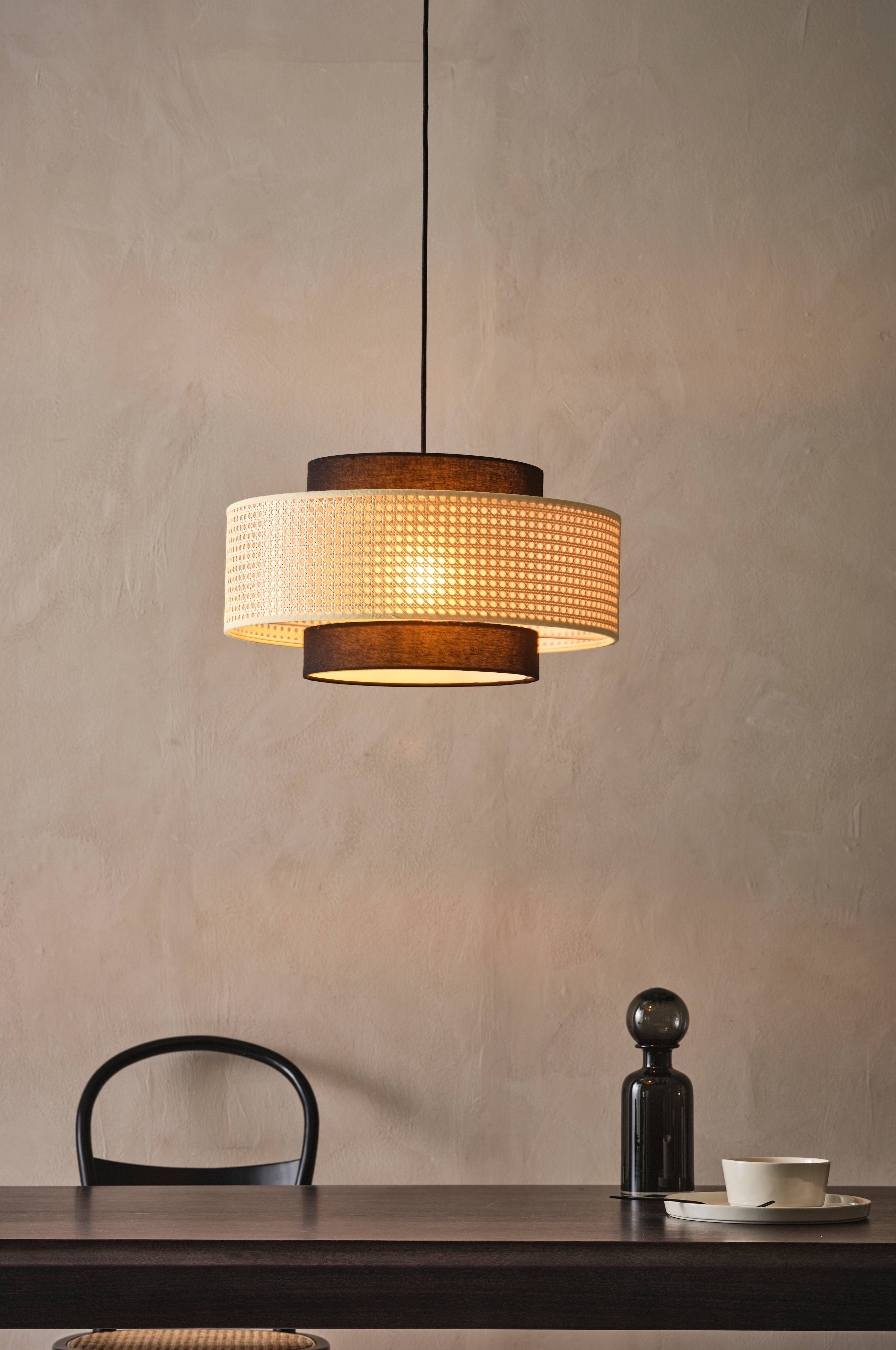 Taklampe med skjerm i rotting og linstoff, stamme av metall. JANE har tydelige retroinfluenser med det indre skjermen av svart lin og rundt den en skjerm av rotting. Svart tekstilkledd ledning passer perfekt til stilen. Takkoppen av plast har krokoppheng. Lampen er ujordet, klasse 2. På grunn av EU-regler kreves en separat takkontakt i visse land. Takkontakten skal være ujordet (klasse 2), og kjøpes separat.