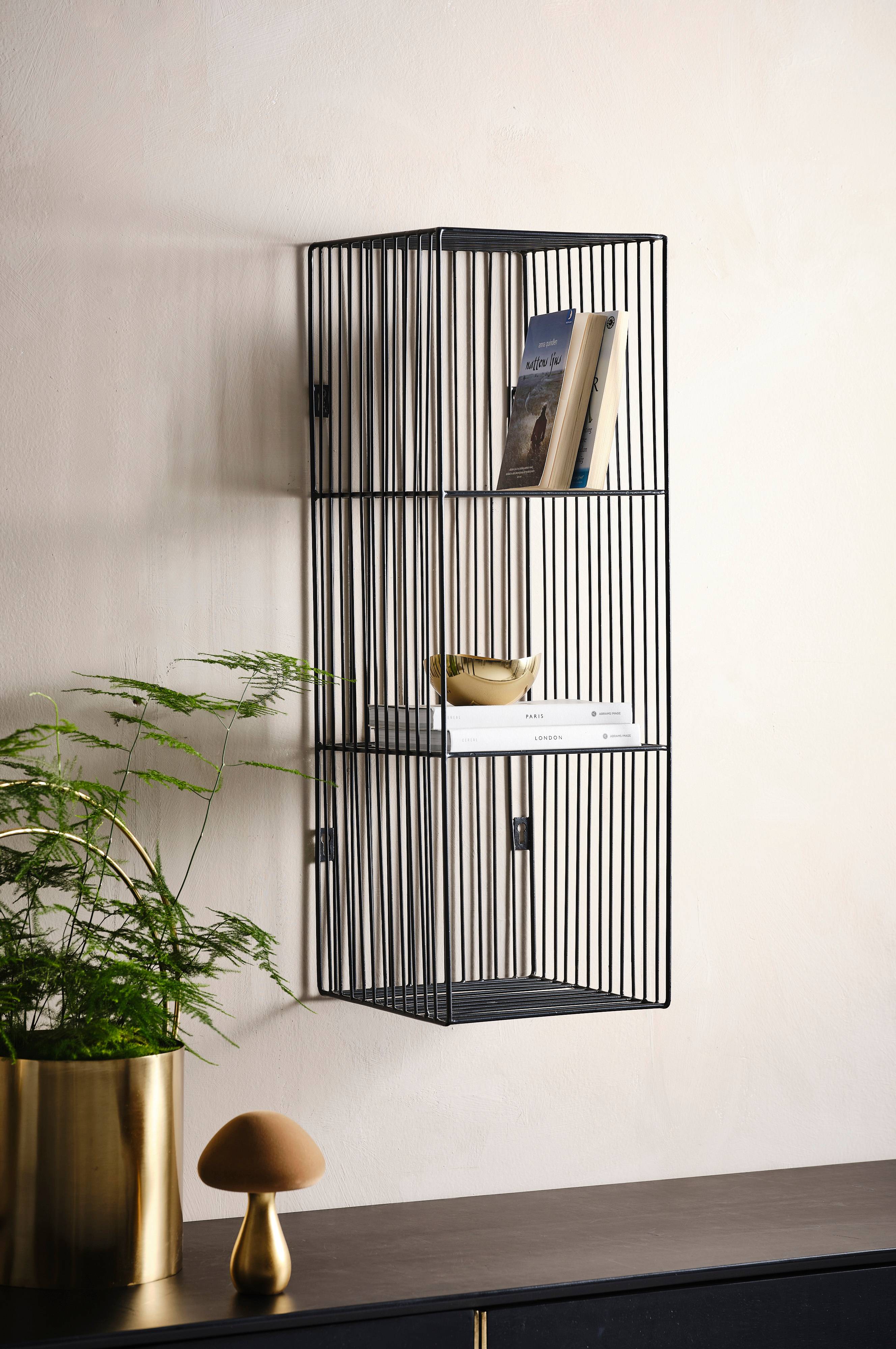 Vegghylle av metall. Hyllen kan henges både loddrett og vannrett. Stilren og praktisk modell med hull til oppheng.