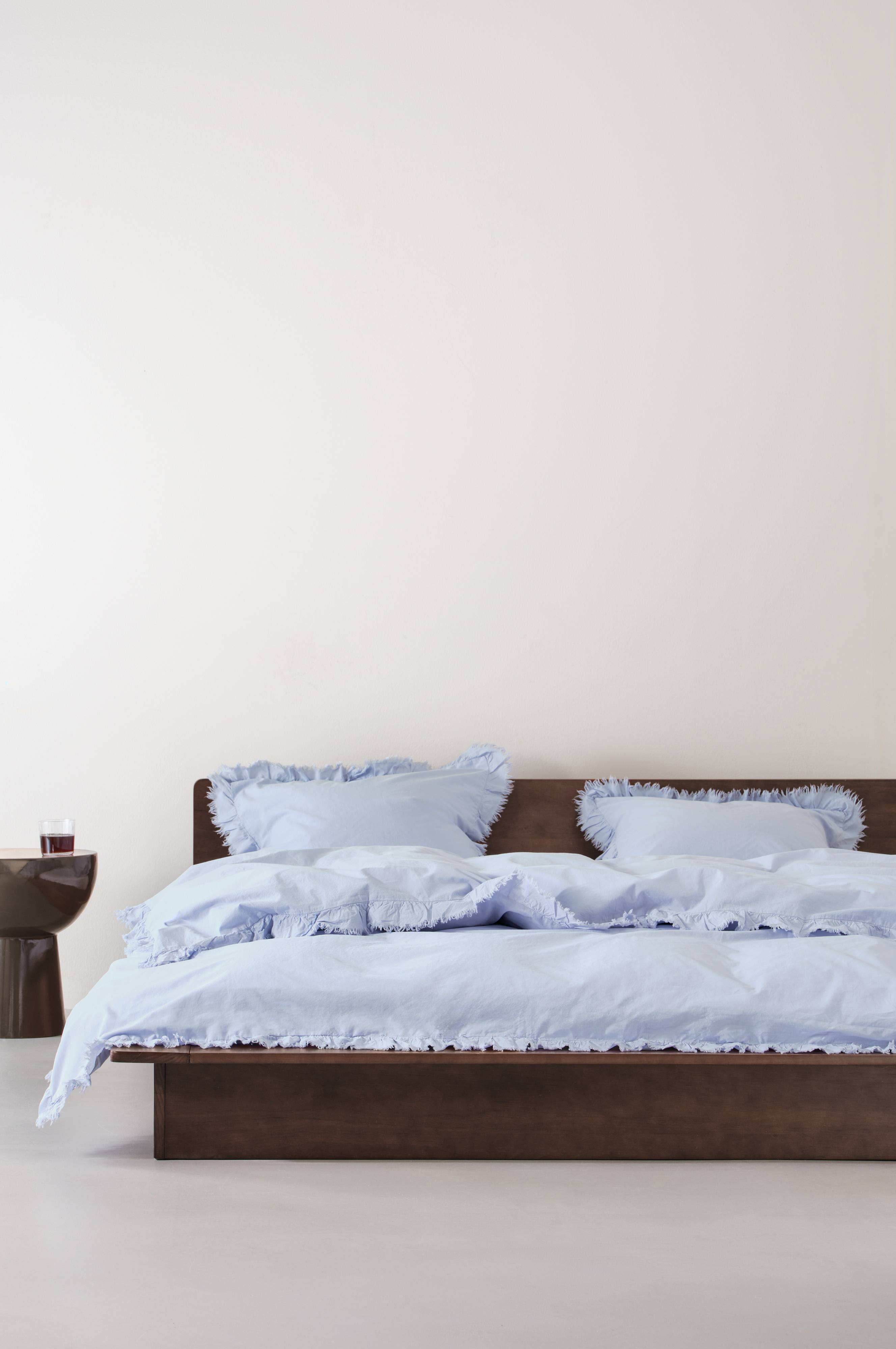 Sengesett i tre deler, et ekstra bredt dynetrekk og to putevar av vasket bomull med myk følelse. Bomull er deilig å re opp med, og oppleves sval og deilig mot huden. JINN har en lett frynset volangkant rundt. Dynetrekket lukkes med trykknapper. Trådtetthet på 144 tc. (Trådtettheten forteller om antallet tråder, thread counts, pr. kvadrattomme i et stoff. Jo høyere trådtetthet, desto høyere kvalitet.)