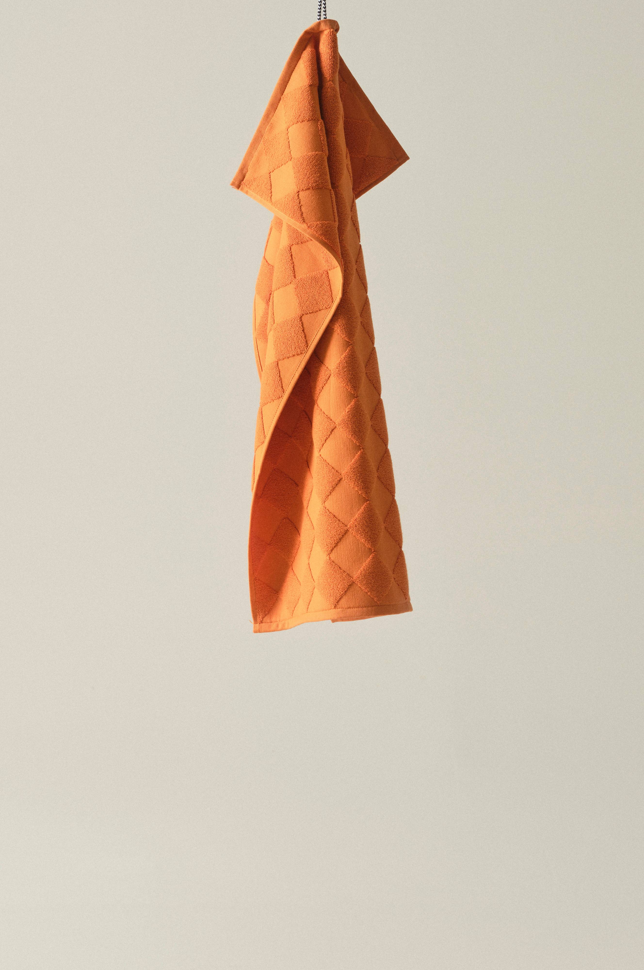 1-pk håndkle i luksuriøs og pen, ensfarget og jacquardvevd bomullsfrotté. Det vevde rutemønsteret er diagonalt med glattvevde ruter og ruter vevd med løkker. Mønsteret er motsatt på andre siden. Håndkleet er dessuten vevd med dobbelt garn, noe som gir en eksklusiv, kraftig følelse. Den luksuriøse følelsen forsterkes av den fine hempen av svarthvitt bomullstau på kortsiden. Frottéen har god absorberingsevne, og blir deiligere jo mer den vaskes. Fremstilt i Portugal. Gramvekt 500 g/m².