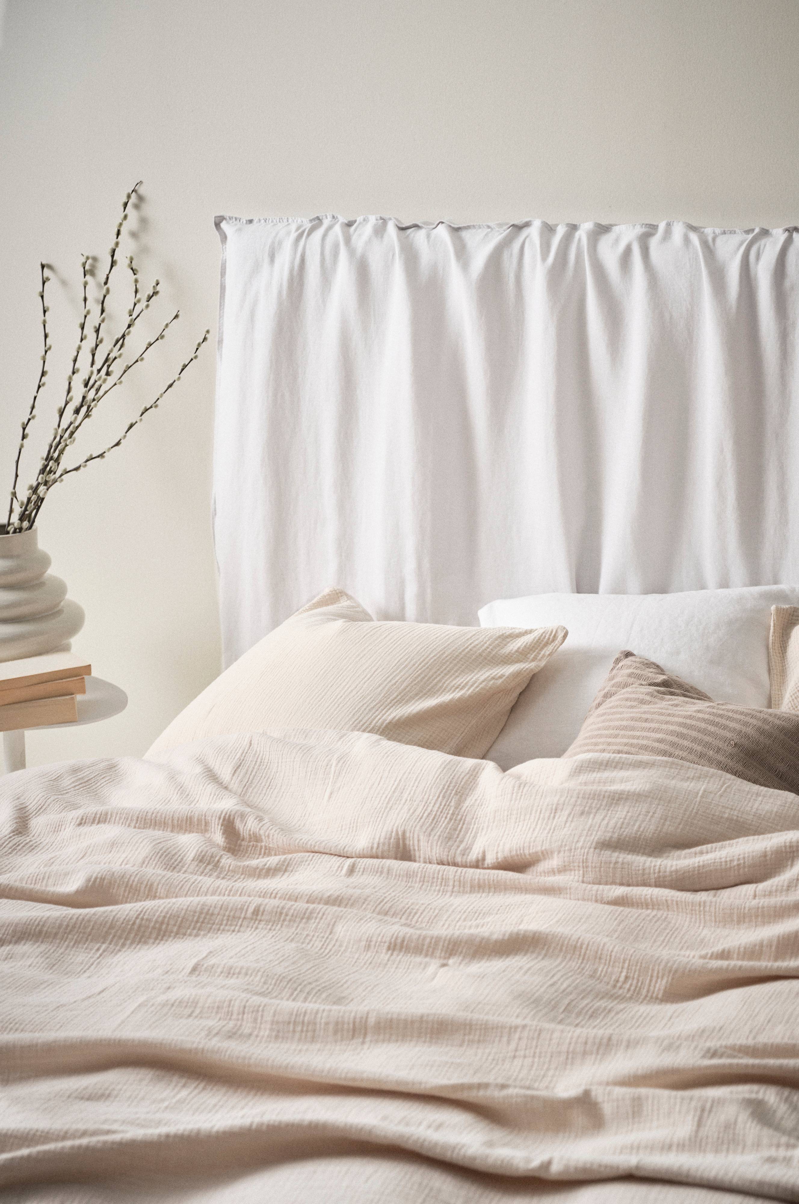 Trekk til sengegavl. Trekk av ekte lin som er sertifisert med European Flax. Trekket tres over sengegavlen slik at den får en ny, fresh look på et blunk. Størrelsen er løs og ledig, og gir en avslappet følelse. Stoffet er i en smidig, litt tynn kvalitet som er komfortabel. Linet i JONIE er vasket for å få en mykere og mer smidig følelse. Lin er en kvalitet som dessuten blir mykere og deiligere med tiden, så du får glede av JONIE i lang tid fremover. Den friske fargeskalaen er inspirert av naturen. Stoffets vekt 160 g/m².