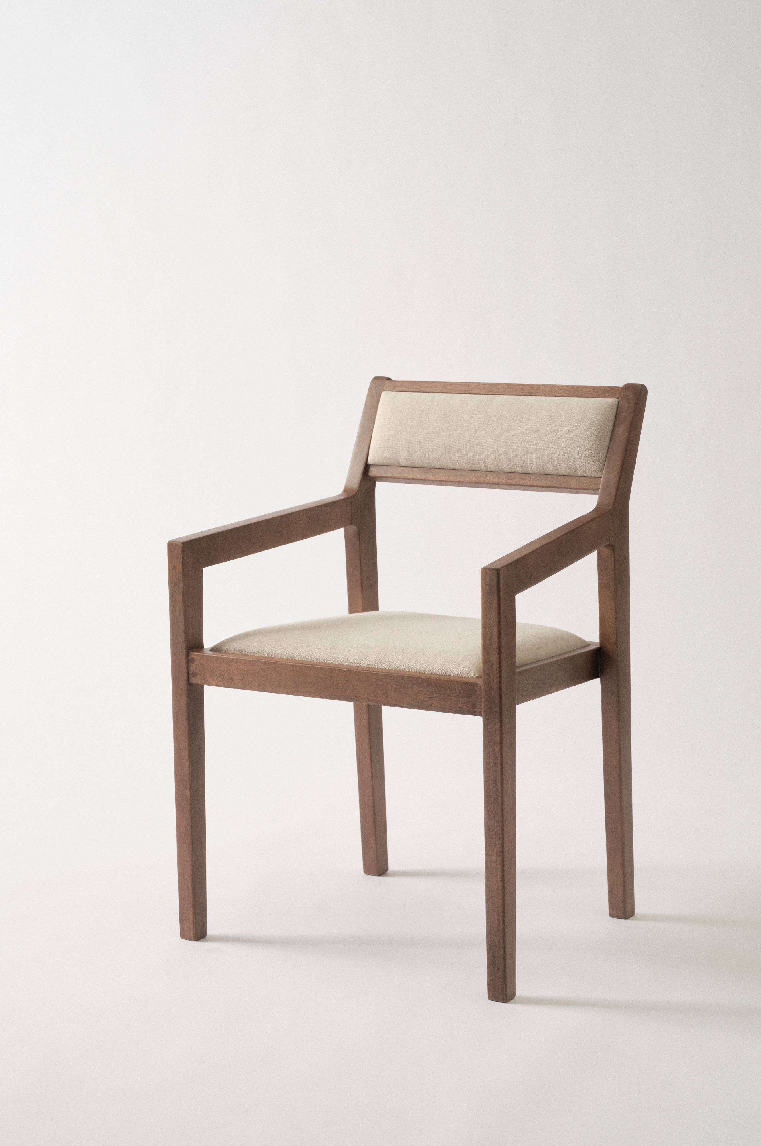 Håndlaget armstol av massiv mango med kryssfiner i setet. Stolen har mykt polstret sete og rygg som er kledd med linstoff. Designen er ren og nedtonet med pene vinkler i beste kolonialstil. TOBA er et fint håndverk som gjør hver stol unik, og armstolen er like pen på kjøkkenet som i stua. Husk å sette møbelknotter under stolbena. Det er ekstra viktig for å unngå misfargning hvis du plasserer den mørke stolen på lyst gulv eller et lyst teppe.