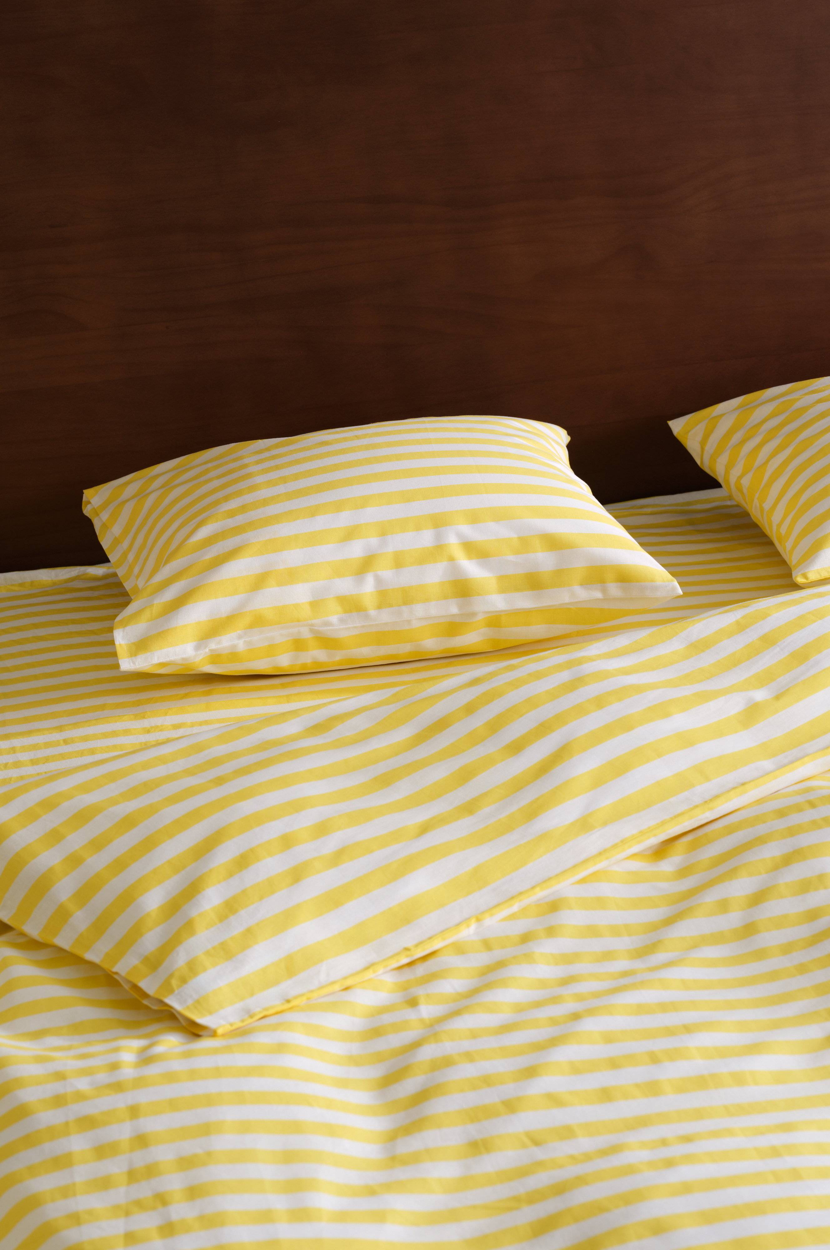 Stripete dynetrekk av bomull. De tverrgående stripene er trykt i friske, sommerlige farger og på begge sider. Bomull er en myk og behagelig kvalitet som føles sval mot huden. Trådtetthet på 144 tc. (Trådtettheten forteller om antallet tråder, thread counts, pr. kvadrattomme i et stoff. Jo høyere trådtetthet, desto høyere kvalitet. Unntaket er lin som ofte veves løsere for å få den riktige følelsen.)