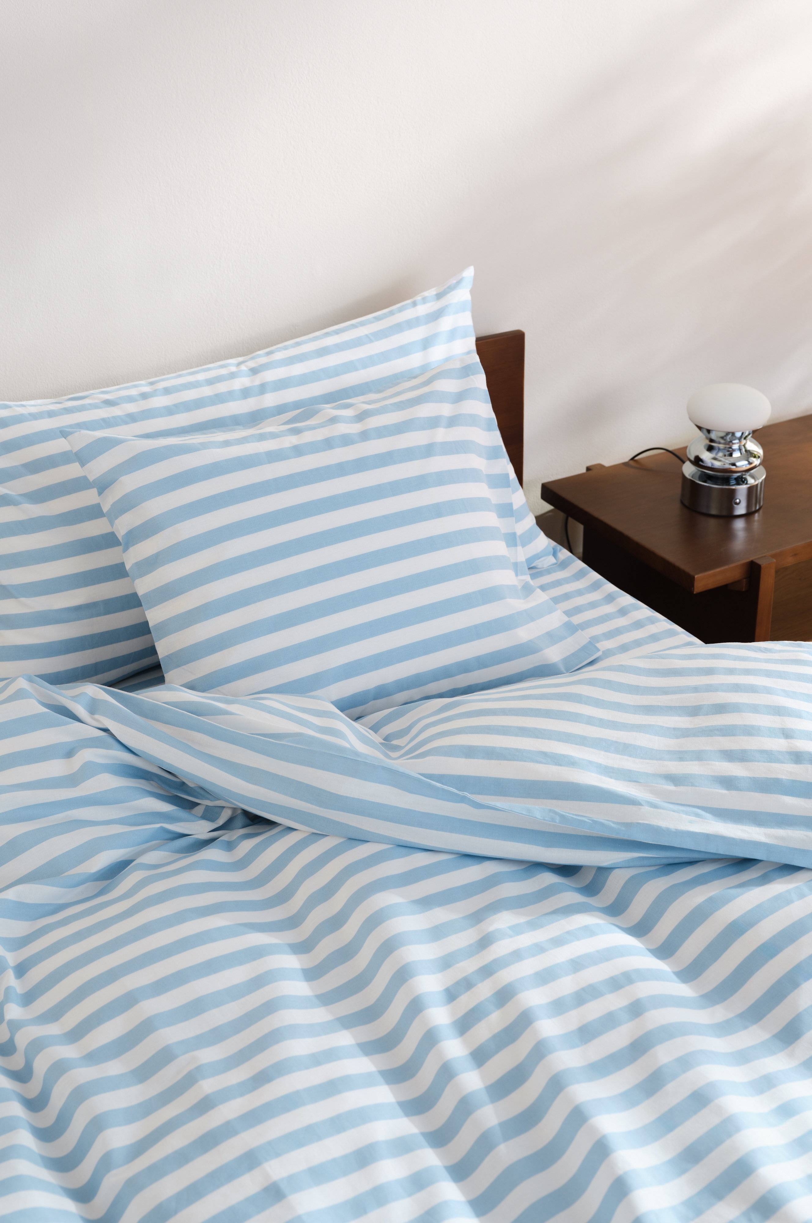 Stripete dynetrekk av bomull. De tverrgående stripene er trykt i friske, sommerlige farger og på begge sider. Bomull er en myk og behagelig kvalitet som føles sval mot huden. Trådtetthet på 144 tc. (Trådtettheten forteller om antallet tråder, thread counts, pr. kvadrattomme i et stoff. Jo høyere trådtetthet, desto høyere kvalitet. Unntaket er lin som ofte veves løsere for å få den riktige følelsen.)