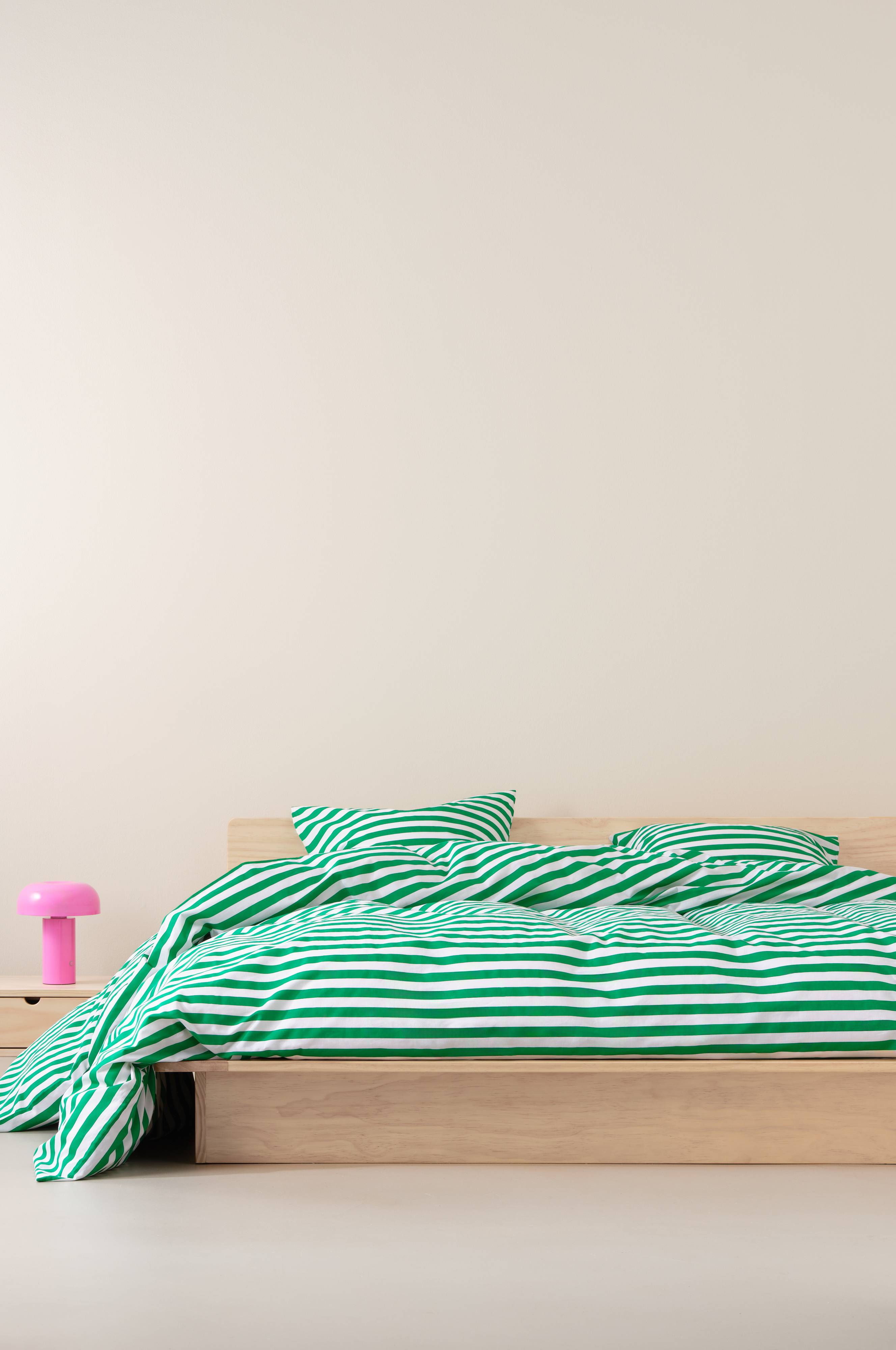 Stripete dynetrekk i tre deler, ett ekstra bredt dynetrekk og to putevar i bomull. Den tverrgående stripen er trykt i friske, sommerlige farger på begge sider av putevarene og dynetrekket. Bomull er en myk og behagelig kvalitet som føles sval mot huden.