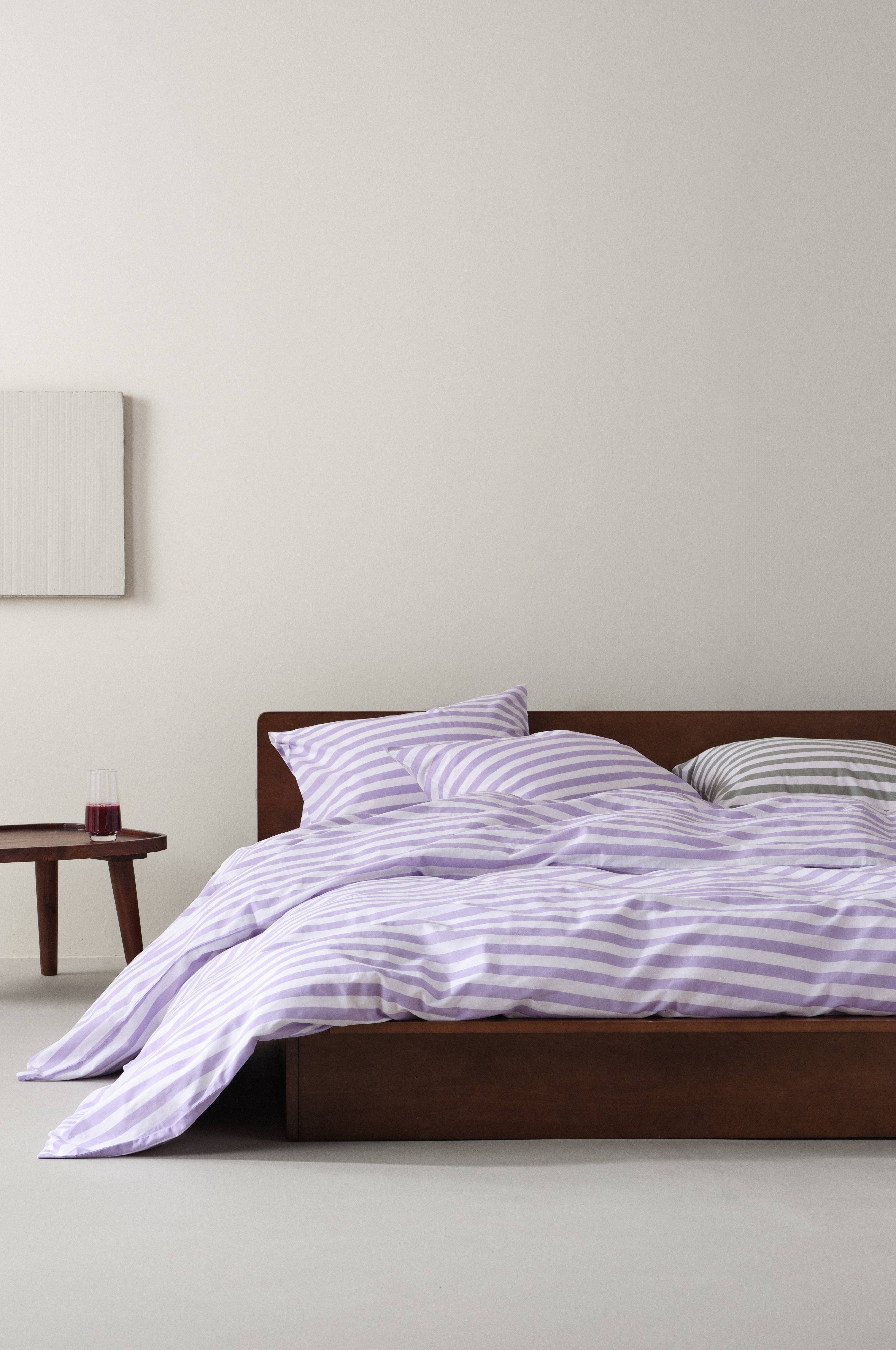 Stripete dynetrekk i tre deler, ett ekstra bredt dynetrekk og to putevar i bomull. Den tverrgående stripen er trykt i friske, sommerlige farger på begge sider av putevarene og dynetrekket. Bomull er en myk og behagelig kvalitet som føles sval mot huden.