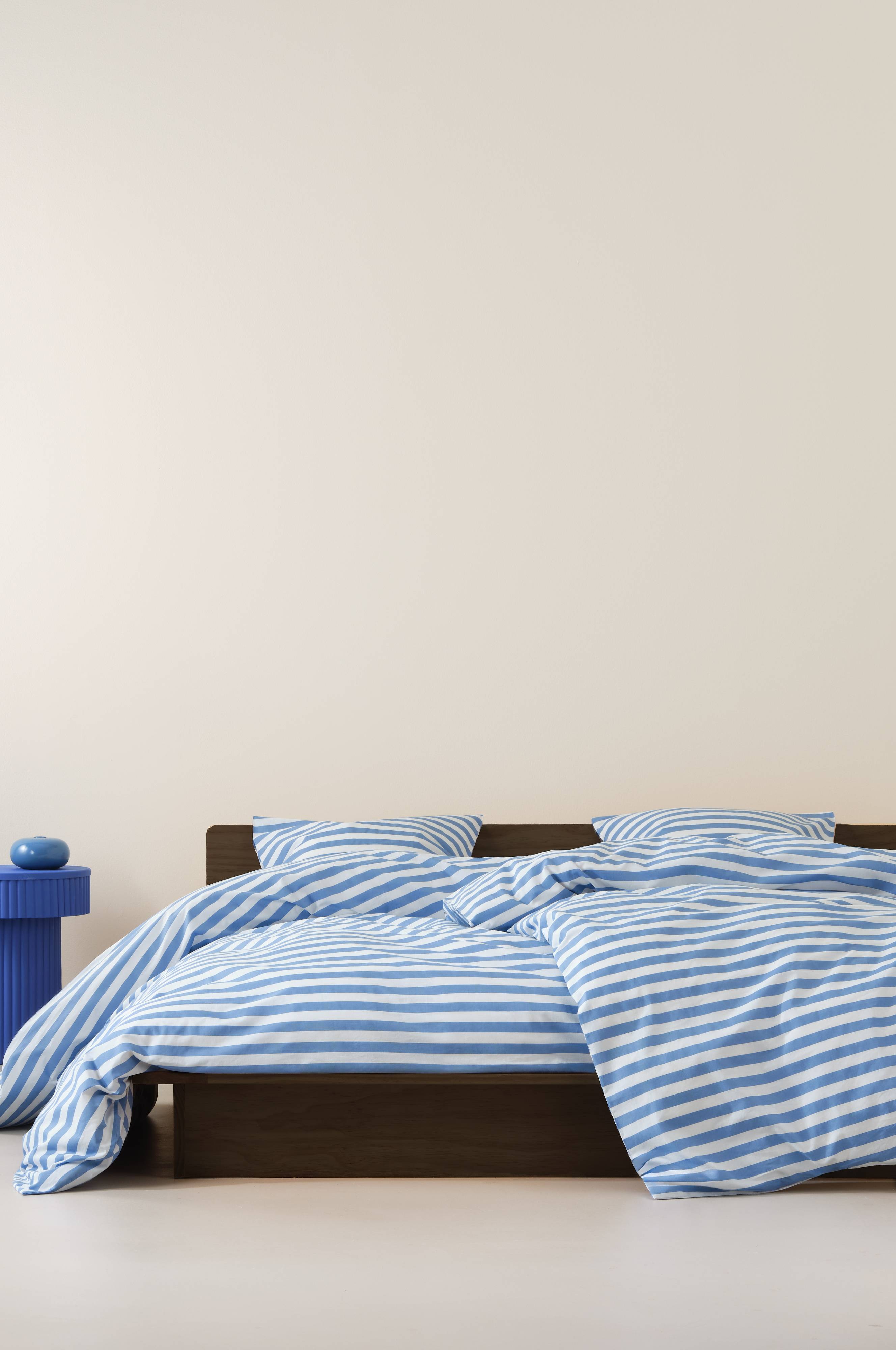 Stripete sengesett i to deler, et dynetrekk og et putevar av bomull. De tverrgående stripene er trykt i friske, sommerlige farger og på begge sider av putevar og dynetrekk. Bomull er en myk og behagelig kvalitet som føles sval mot huden. Åpning øverst i hjørnene på dynetrekket. Det gjør det lettere å tre dynetrekket over dynen. Trådtetthet på 144 tc. (Trådtettheten forteller om antallet tråder, thread counts, pr. kvadrattomme i et stoff. Jo høyere trådtetthet, desto høyere kvalitet. Unntaket er lin som ofte veves løsere for å få den riktige følelsen.)
