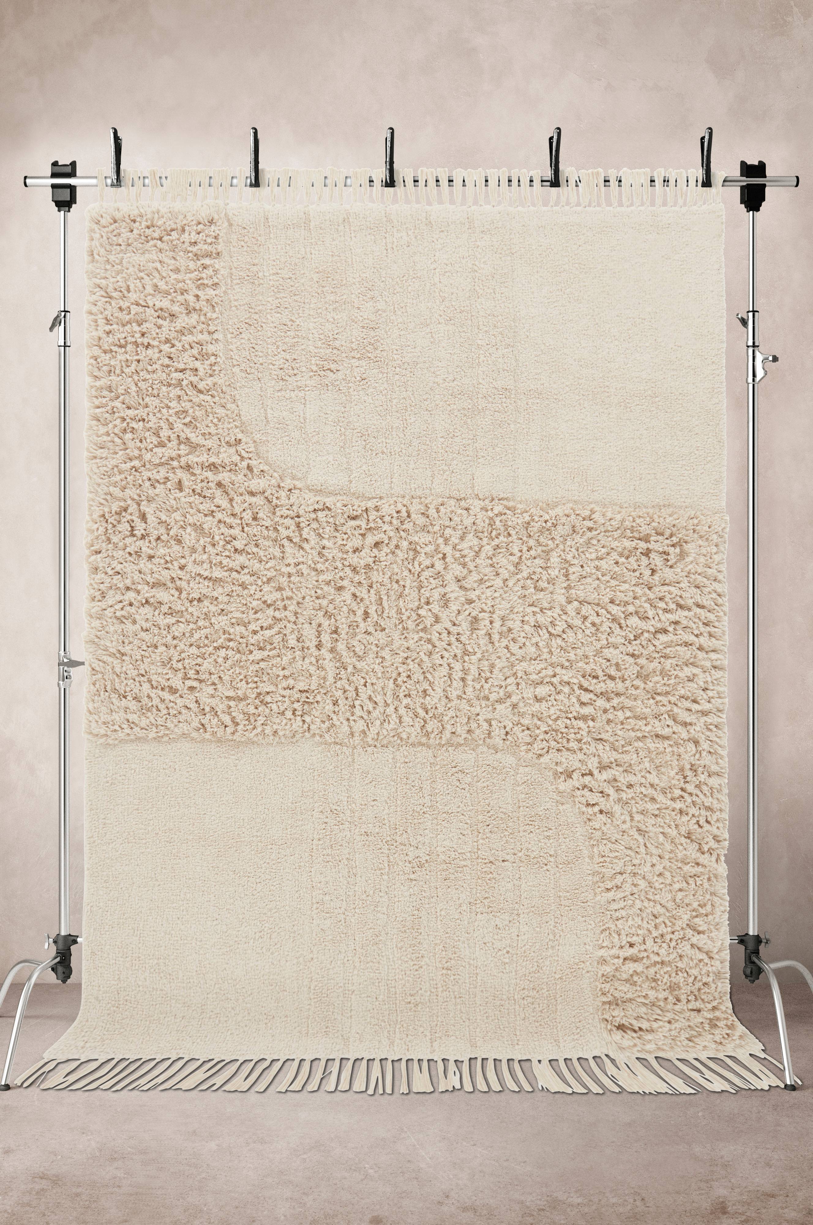 ElpyTuftet teppe av bomull i en smidig kvalitet som er myk og komfortabel. Teppets mønster er skapt av at luggen har ulike lengder. Teppet har frynser langs kortsidene. Frynselengde 8 cm. Lugghøyde 1 cm, 1,5 cm og 3 cm. Tykkelse 3,1 cm. 1500 g/m².