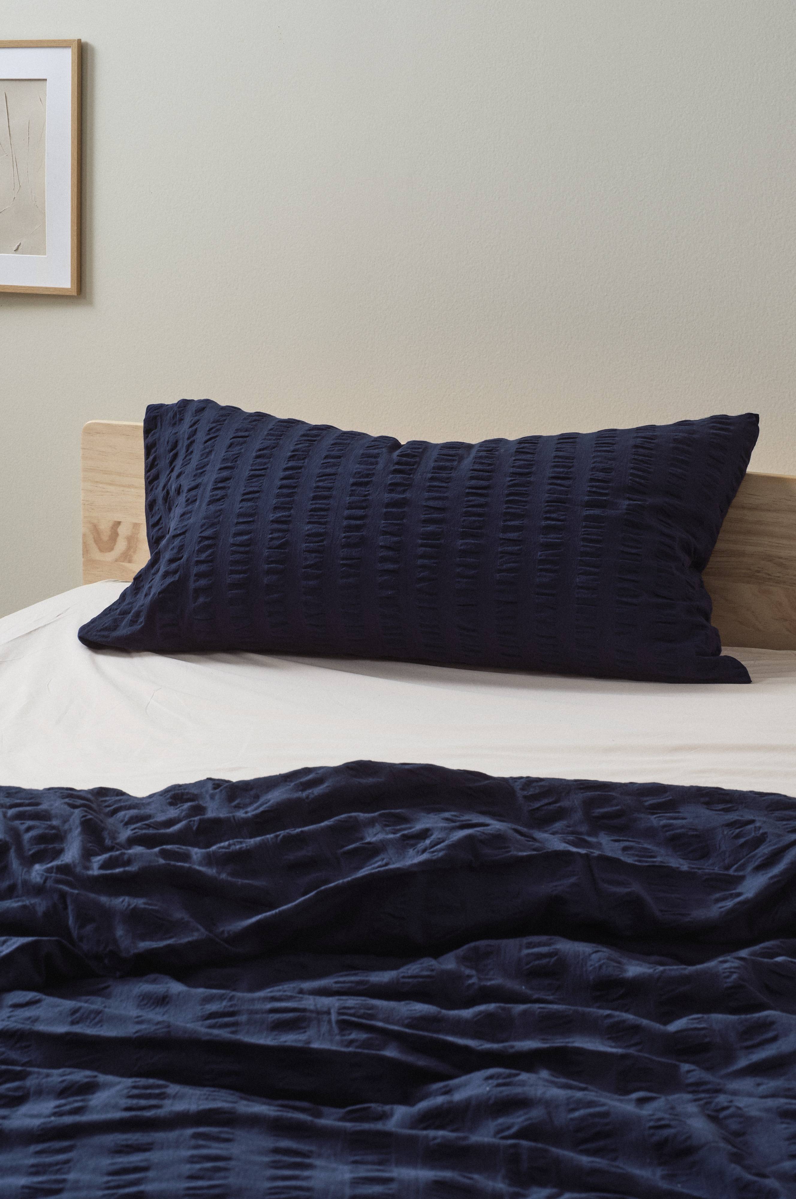 Putevar i herlig krepp av sertifisert, økologisk bomull. Krepp er en luftig kvalitet, og det boblete stoffet føles svalt og har komfortabel pusteevne. Serien KIMMI er ensfarget og samtidig stripete. Annenhver stripe er glatt, vevd stoff og annenhver stripe er i krepp. Stoffet er garnfarget og vasket for å få en mykere følelse. Trådtetthet på 120 tc. (Trådtettheten forteller om antallet tråder, thread counts, pr. kvadrattomme i et stoff. Jo høyere trådtetthet, desto høyere kvalitet.)