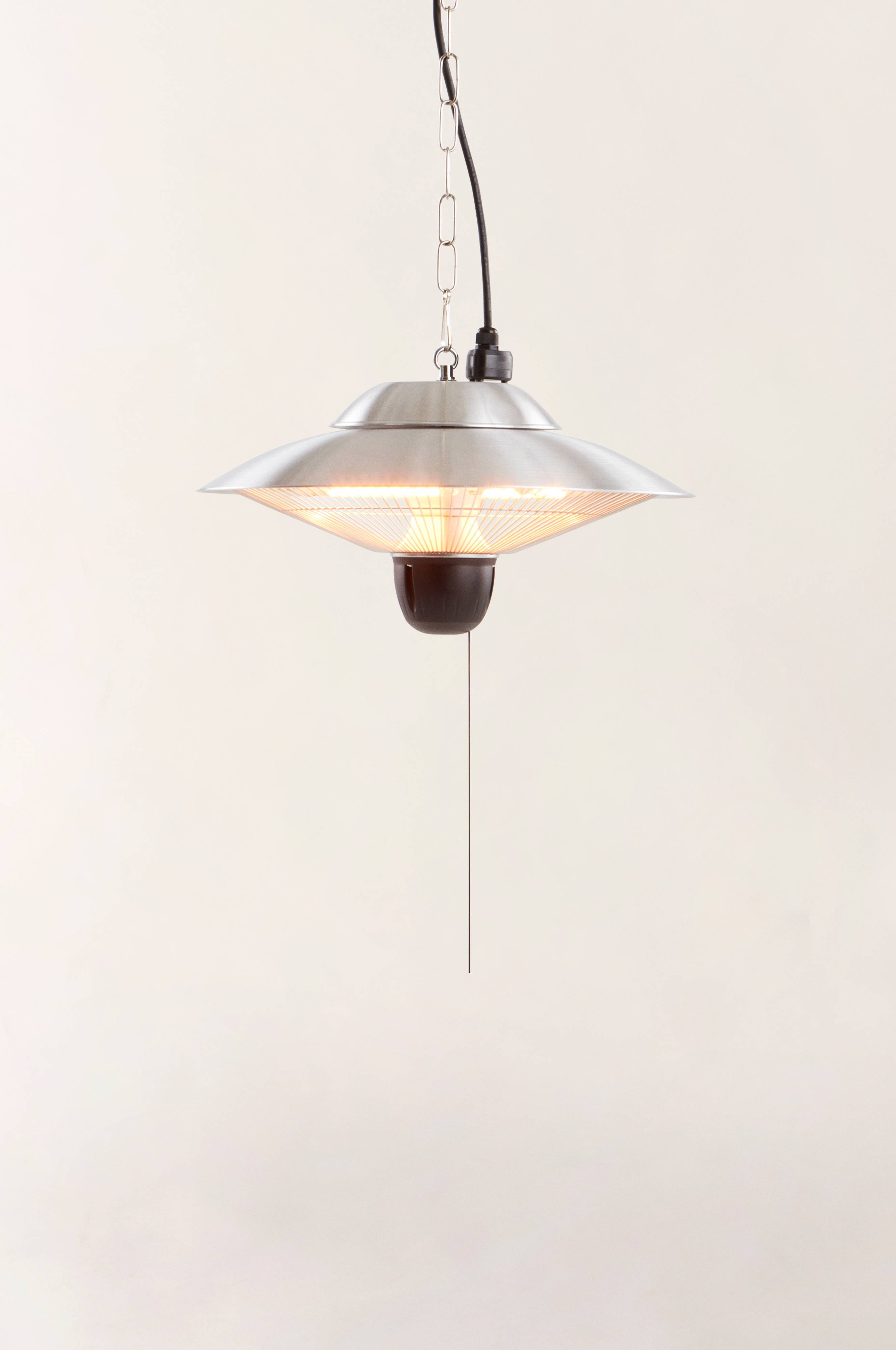 Hengende terrassevarmer for utendørs bruk. Terrassevarmeren er i aluminium og skal henge i taket slik at den sprer varmen nedover på en behagelig måte i uterommet, på balkongen, i campingvognens fortelt eller på uteserveringen. Varmeren har tre effektnivå slik at du kan tilpasse varmen. Terrassevarmeren gir umiddelbar varme og et behagelig varmt lys. Terrassevarmeren har 1,9 m jordet ledning med stikkontakt.
