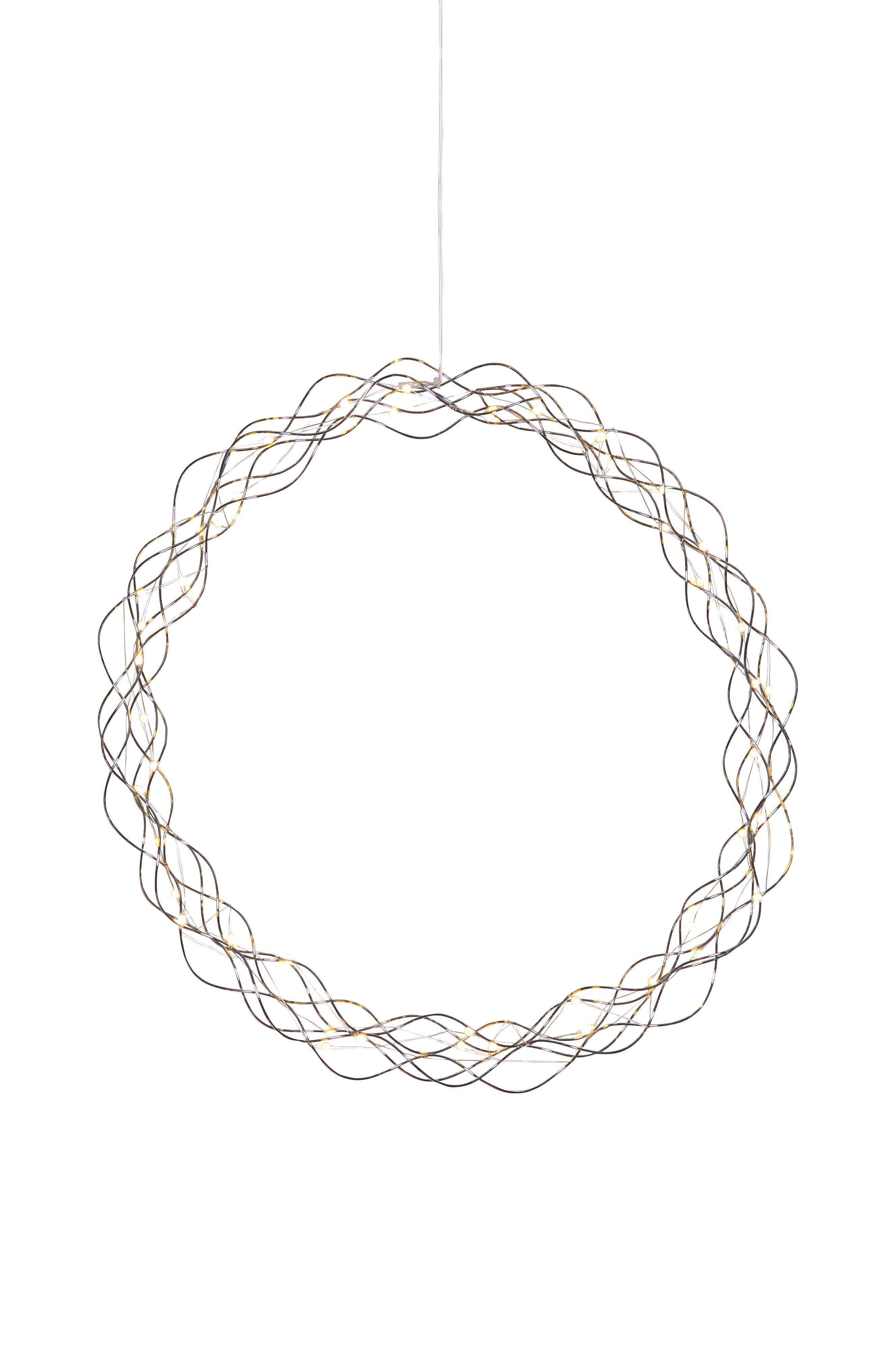 Dekorativ krans med duggdråpe-lyskjede for innendørs bruk. Kransen har 50 led-lyspunkter med varmhvit glød. Dimmer i tre trinn og timer. Fin dekorasjon til å henge i vinduet.