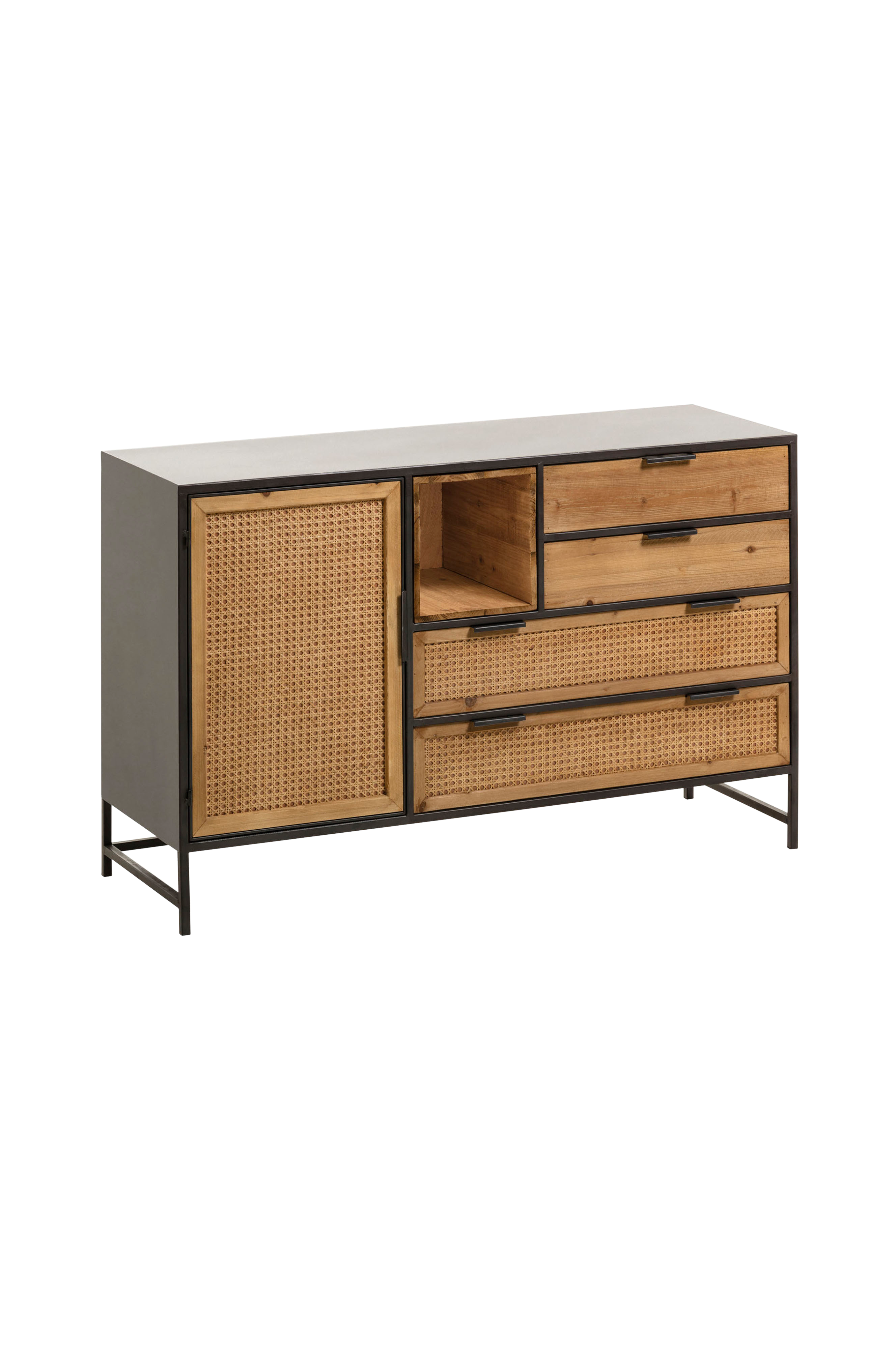 Stilrent sidebord med stamme av metall. Sidebordet har praktiske skuffer med massive tredører.