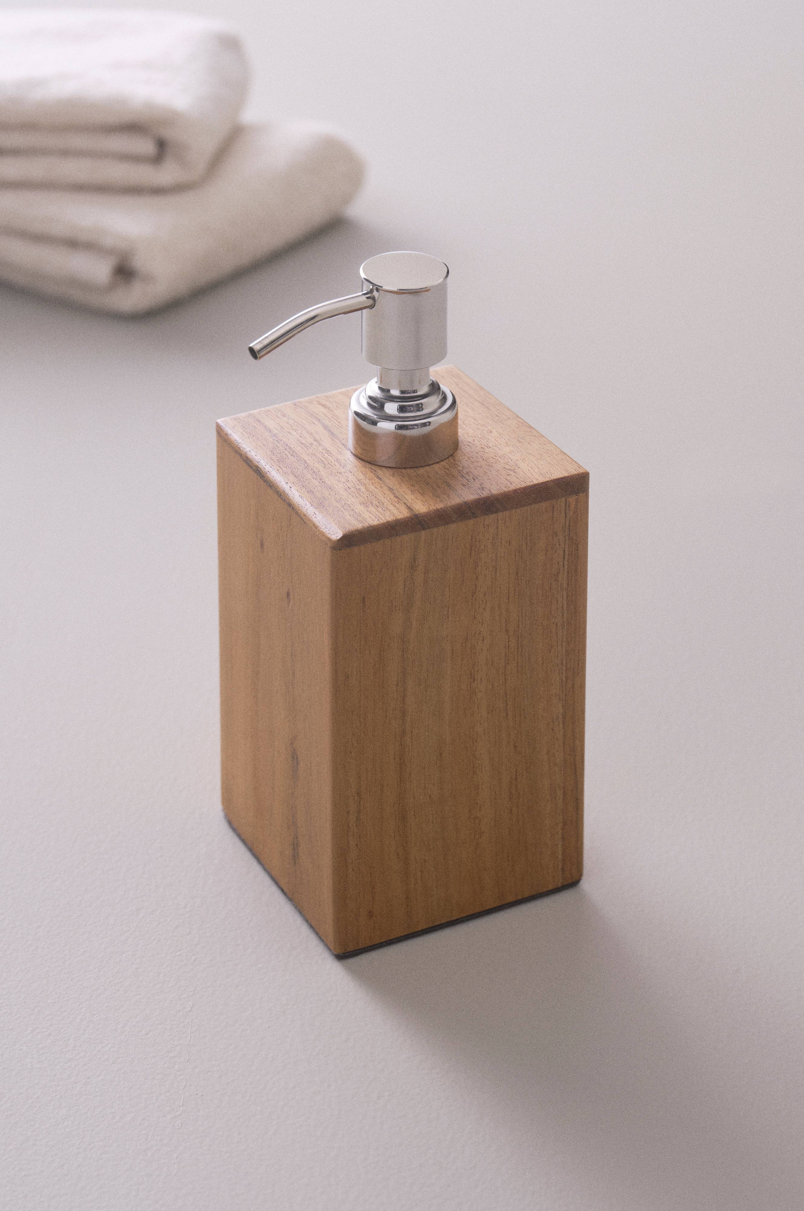 Firkantet såpepumpe av mangotre med vakker ådring og dyp, fin trefarge. Pumpen skrus opp, og du fyller enkelt på med din flytende favorittsåpe. Innsiden er plastbelagt, og pumpen er også av plast. Baderomsserien KYOKO finnes i flere deler som gir baderommet en varm og stilig følelse.