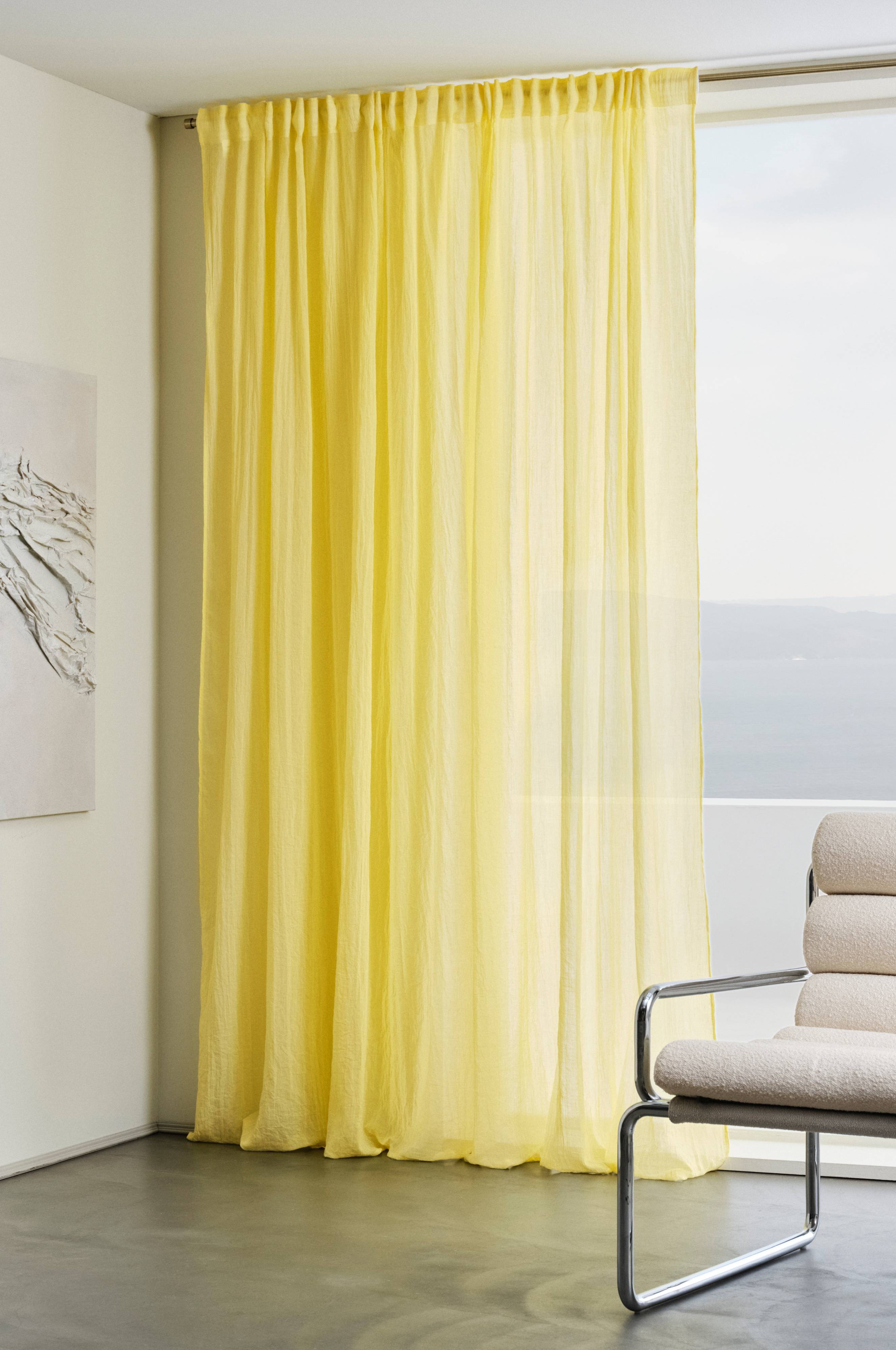 Ekstra bred gardinlengde i tynn og luftig kvalitet av polyester/bomull som faller lett. Med påsydd multifunksjonsbånd. Gardinen kan henges opp med fingerkroker, kanal samt skjulte hemper.