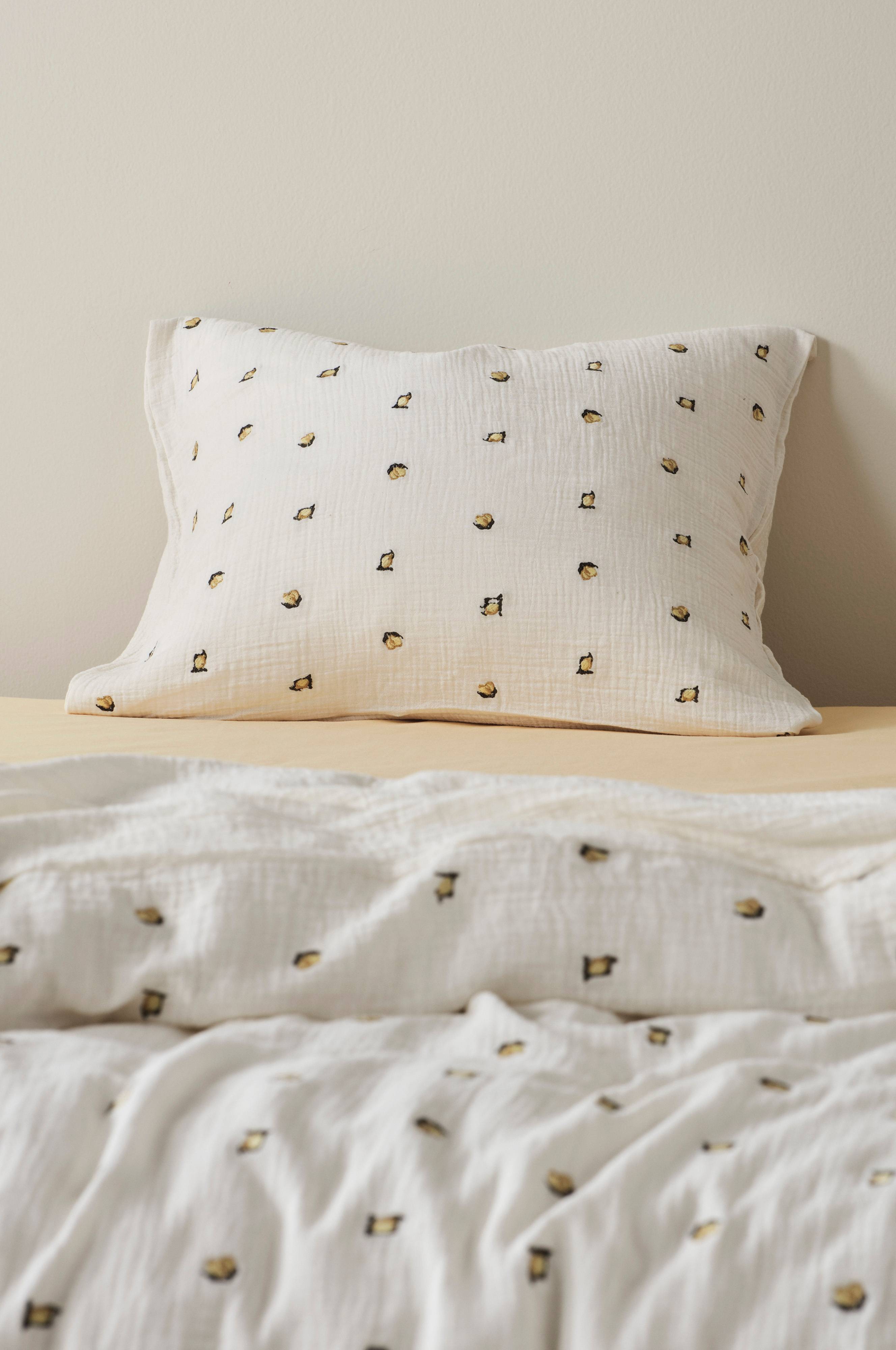 1-pk putevar i herlig, økologisk bomullsmusselin med broderte små sitroner. Musselin er et mykt, tynt stoff i to lag, vevd med boblete effekt som gjør stoffet mykt og ekstra lettstelt. Du trenger hverken stryke eller mangle. Det behagelige musselinstoffet er deilig å sove i. Trådtetthet på 178 tc. (Trådtettheten forteller om antallet tråder, thread counts, pr. kvadrattomme i et stoff. Jo høyere trådtetthet, desto høyere kvalitet.)
