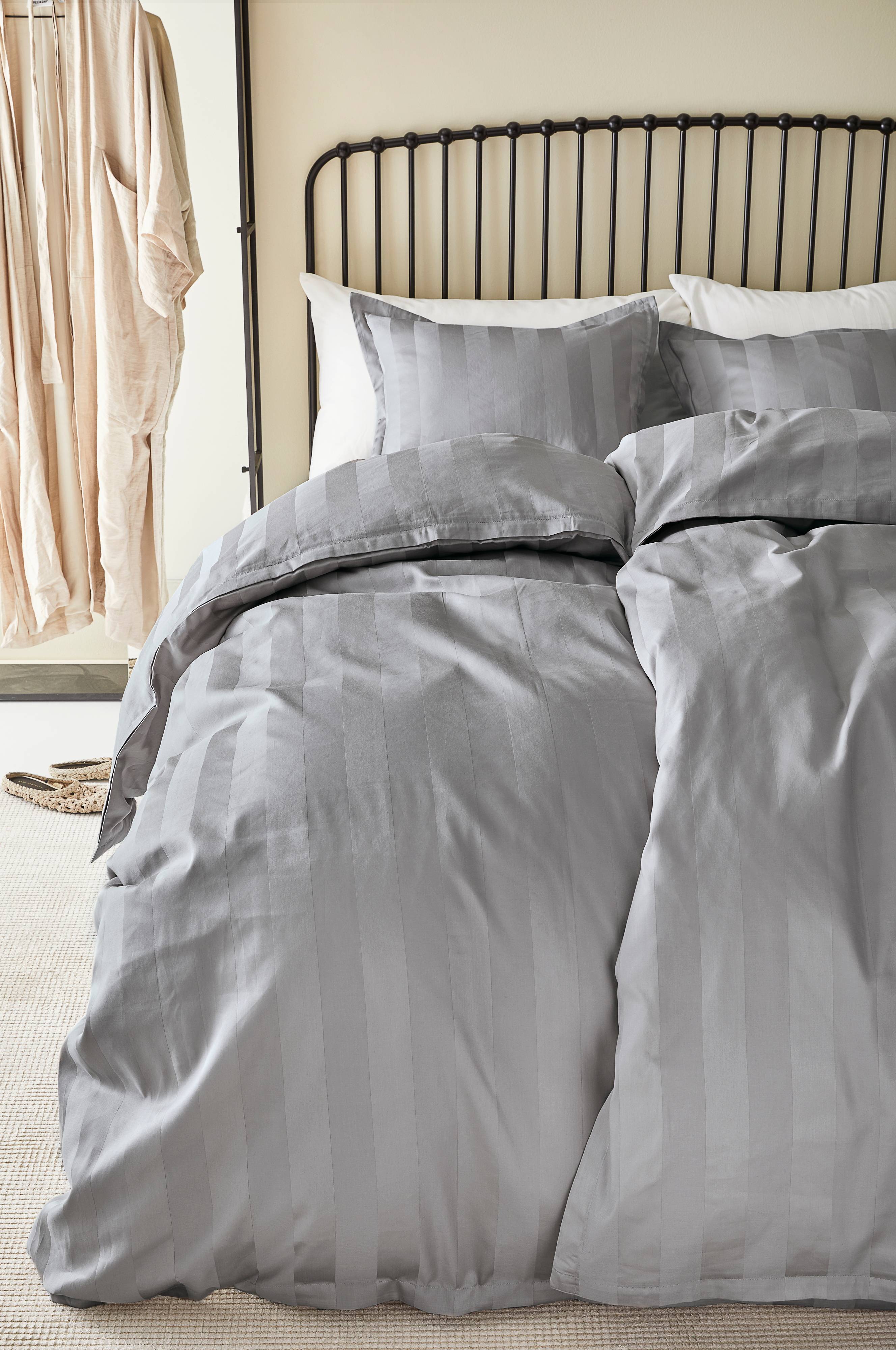 Dynetrekk i sateng av økologisk bomull. Sateng er en veveteknikk som gir et herlig glatt og mykt stoff. Bomull som veves med denne teknikken blir til et stoff med fin glans og luksuriøs følelse. LEONA er et ensfarget dynetrekk som har vevde striper ton-i-ton. Trådtetthet på 300 tc. (Trådtettheten forteller om antallet tråder, thread counts, pr. kvadrattomme i et stoff. Jo høyere trådtetthet, desto høyere kvalitet).