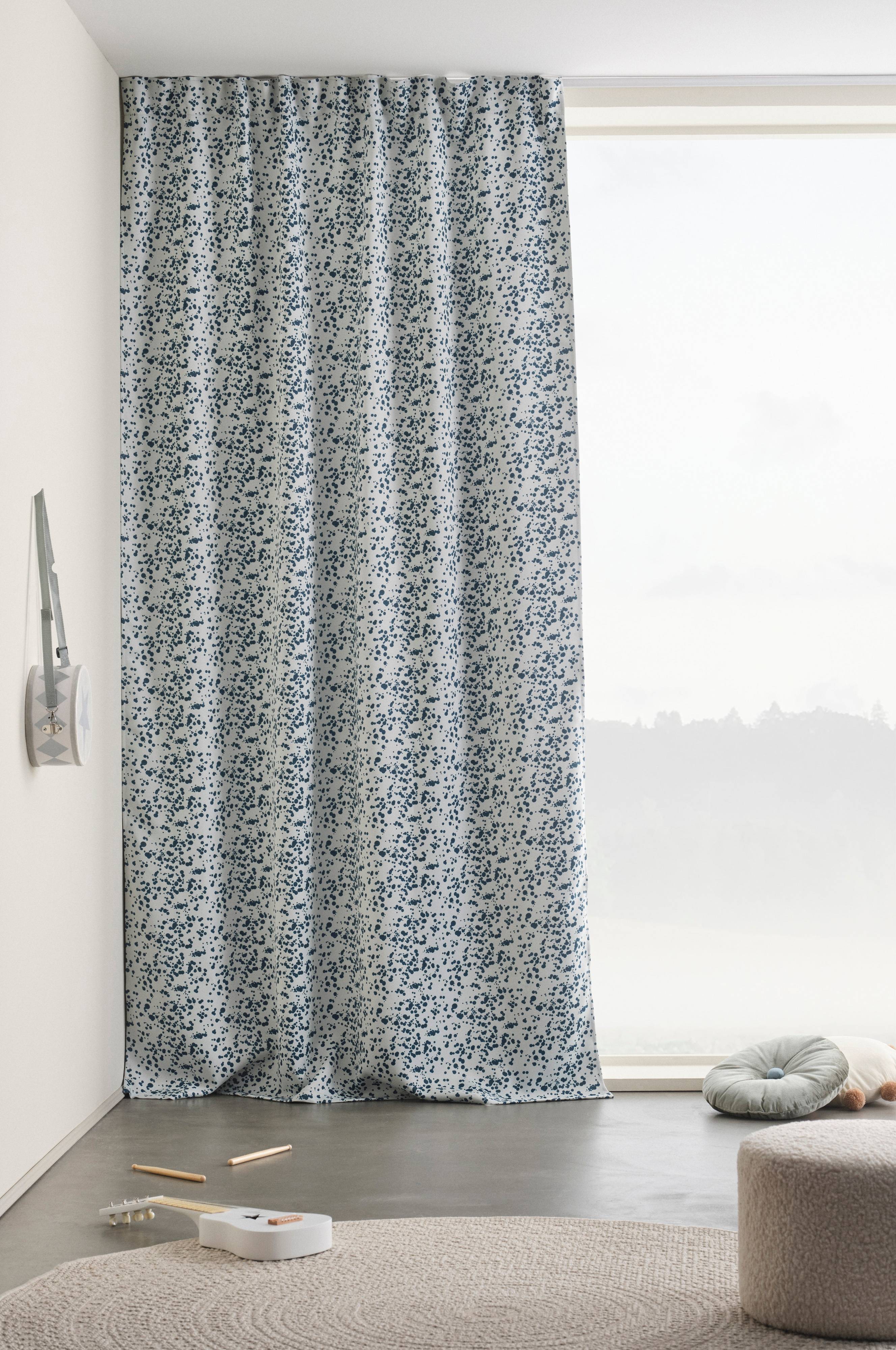 LETICIA er en gardinlengde for blendingsgardiner. Gardinlengden er laget av polyester, og halvparten er resirkulert materiale. Det sterke stoffet stenger lyset ute og mørklegger barnerommet, soverommet eller TV-rommet. Gardinlengden har et prikkete sprutmønster på den lyse undersiden inn mot rommet og et lysblokkerende belegg på baksiden.
