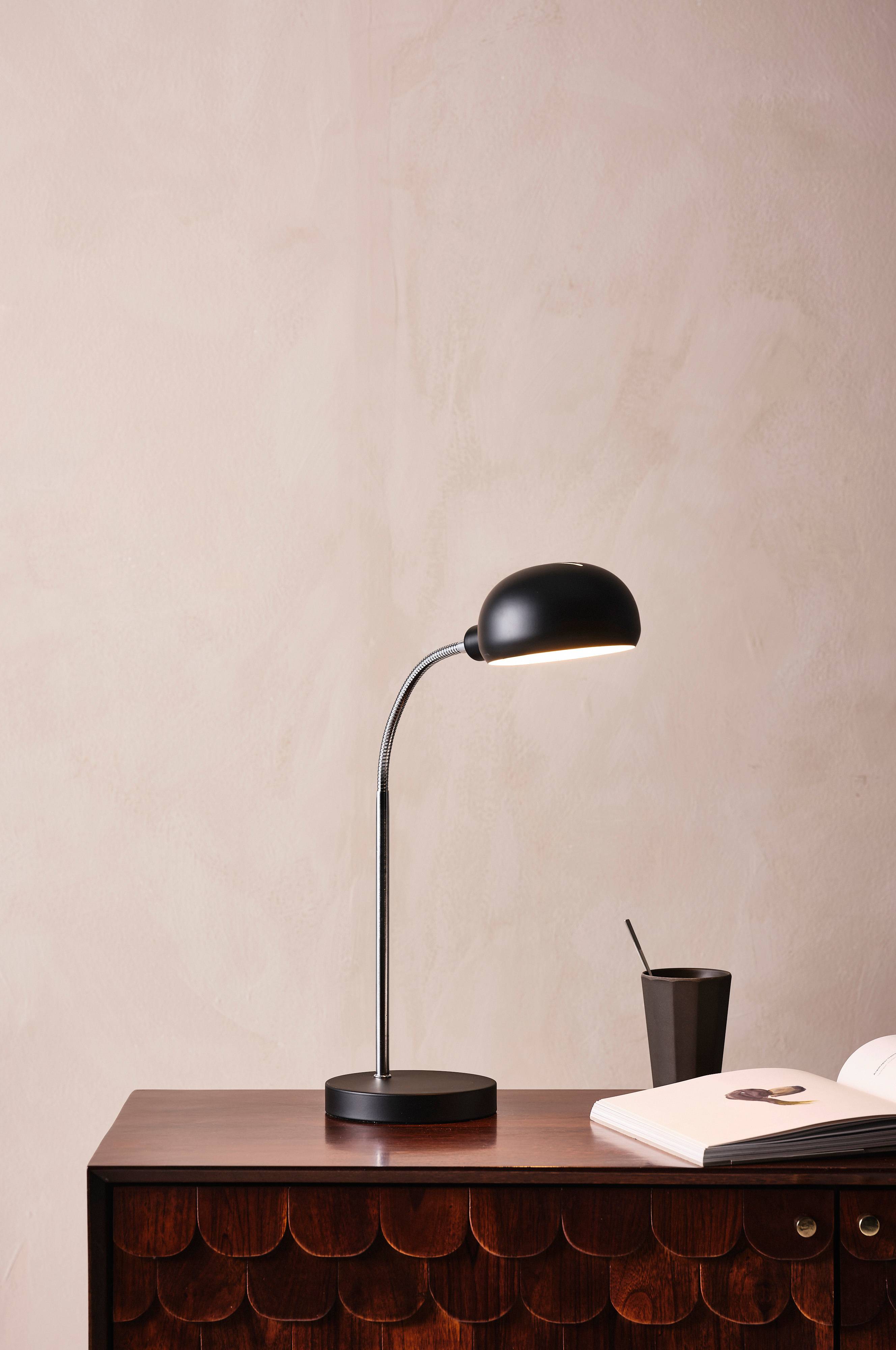 Bordlampe i mattsvart metall med forkrommede detaljer. Bordlampen har moderne design og klassisk utstråling. Svart ledning, ledningslengde 2 m.