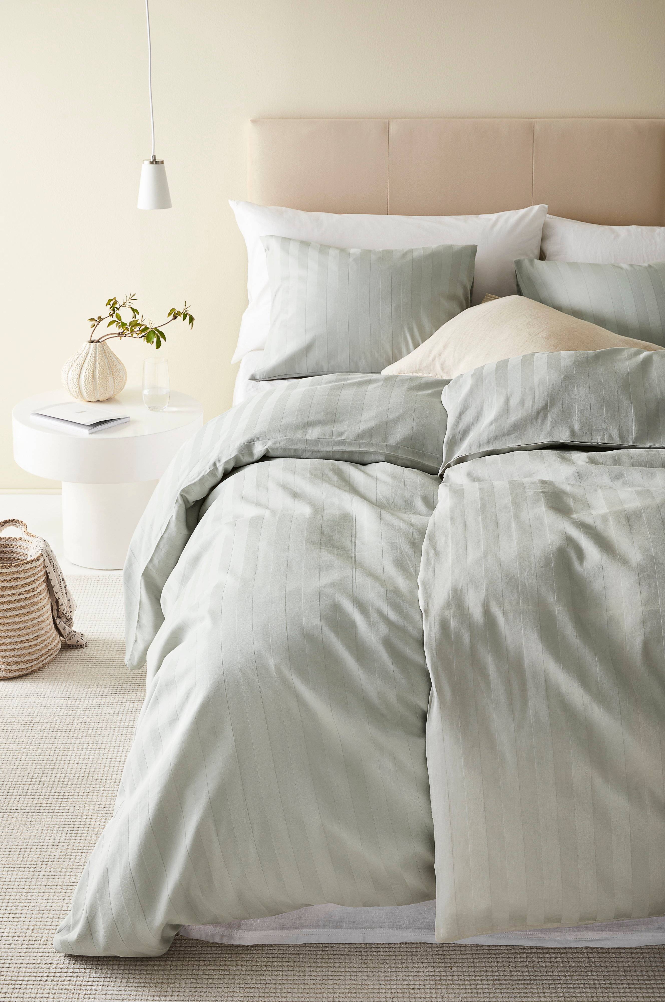 Ensfarget dynetrekk i sateng av bomull med vevde striper ton-i-ton. Sateng er en veveteknikk som gir et herlig glatt og mykt stoff. Bomull som veves med denne teknikken blir til et stoff med fin glans og luksuriøs følelse. Trådtetthet på 215 tc. (Trådtettheten forteller om antallet tråder, thread counts, pr. kvadrattomme i et stoff. Jo høyere trådtetthet, desto høyere kvalitet). Åpning øverst i hjørnene på dynetrekket.