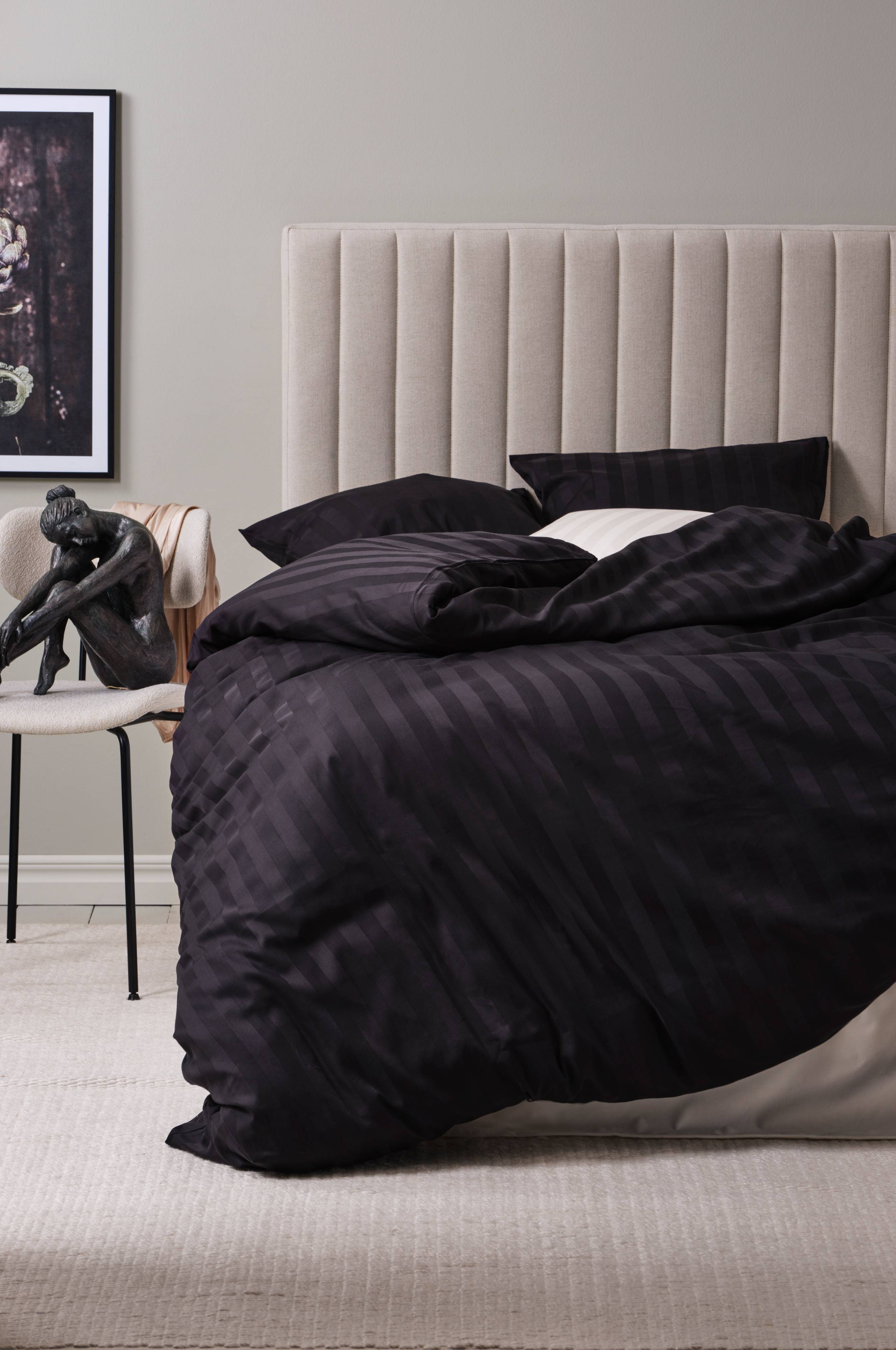 Ensfarget sengesett i 3 deler i sateng av bomull med vevde striper ton-i-ton. Sateng er en veveteknikk som gir et herlig glatt og mykt stoff. Bomull som veves med denne teknikken blir til et stoff med fin glans og luksuriøs følelse. Åpning øverst i hjørnene på dynetrekket. Trådtetthet på 215 tc. (Trådtettheten forteller om antallet tråder, thread counts, pr. kvadrattomme i et stoff. Jo høyere trådtetthet, desto høyere kvalitet).