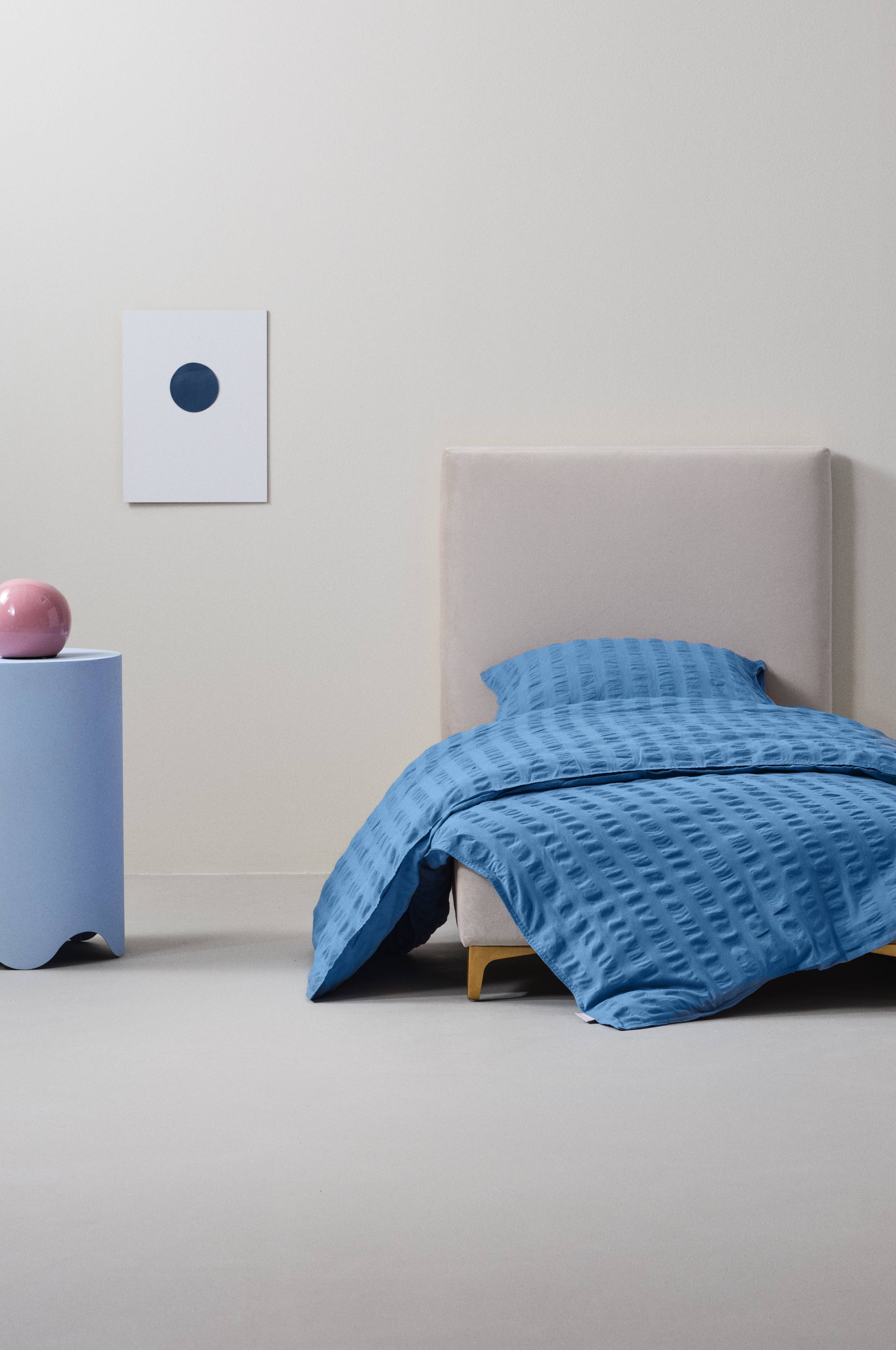 Dynetrekk i herlig krepp av sertifisert, økologisk bomull. Krepp er en luftig kvalitet, og det boblete stoffet føles svalt og har komfortabel pusteevne. Serien LOLO er ensfarget og samtidig stripete, glattvevd stoff veksles med striper i krepp. Stoffet er garnfarget og vasket for å få en mykere følelse. Trådtetthet på 120 tc. (Trådtettheten forteller om antallet tråder, thread counts, pr. kvadrattomme i et stoff. Jo høyere trådtetthet, desto høyere kvalitet.)