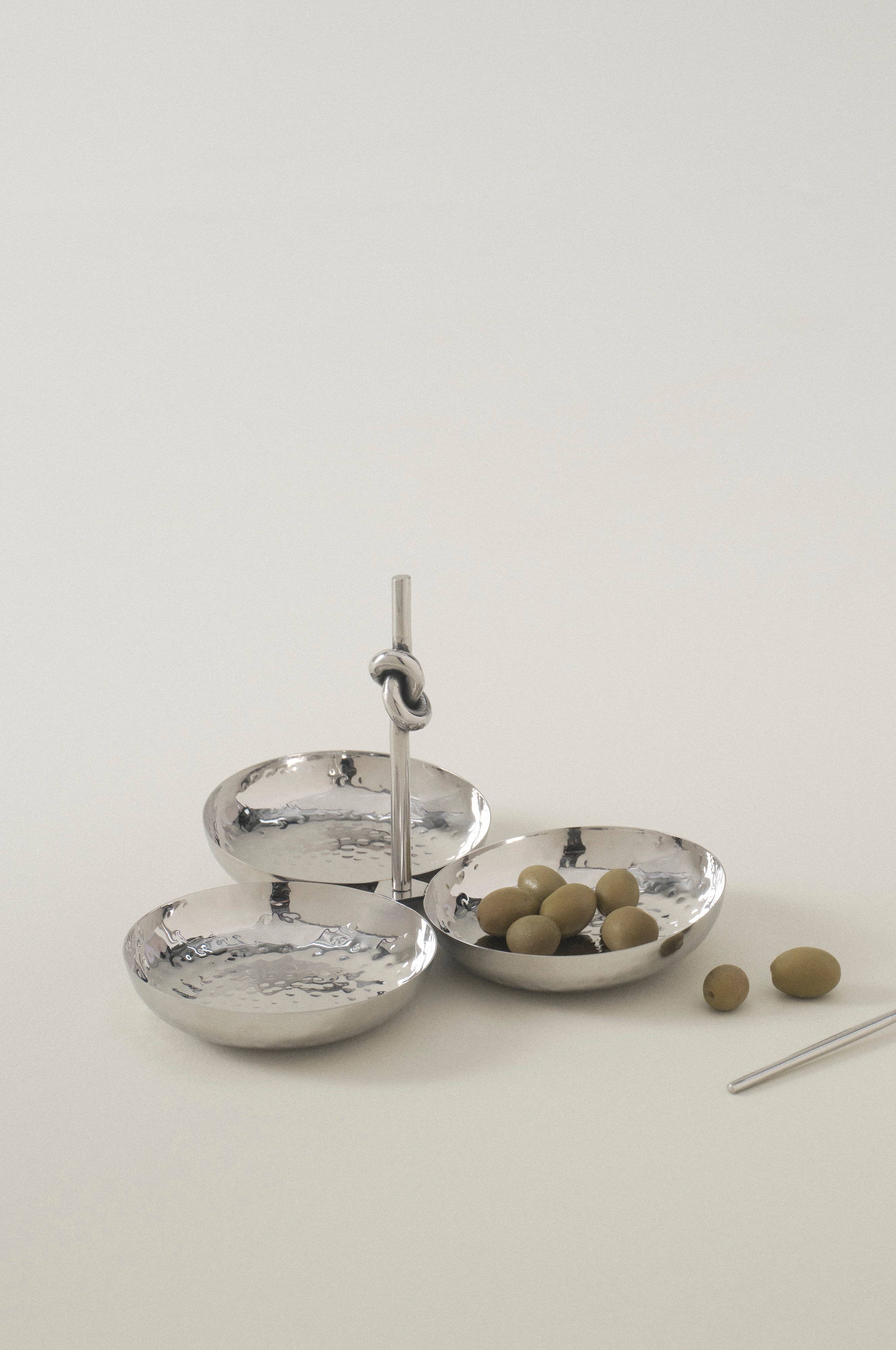 Serveringsskål av rustfritt stål, med tre mindre skåler som sitter sammen med et håndtak i midten. Perfekt til buffetbordet, taco, ulike dressinger eller nøtter og snacks. LOOP har en rustikk design med knute på skaftet.