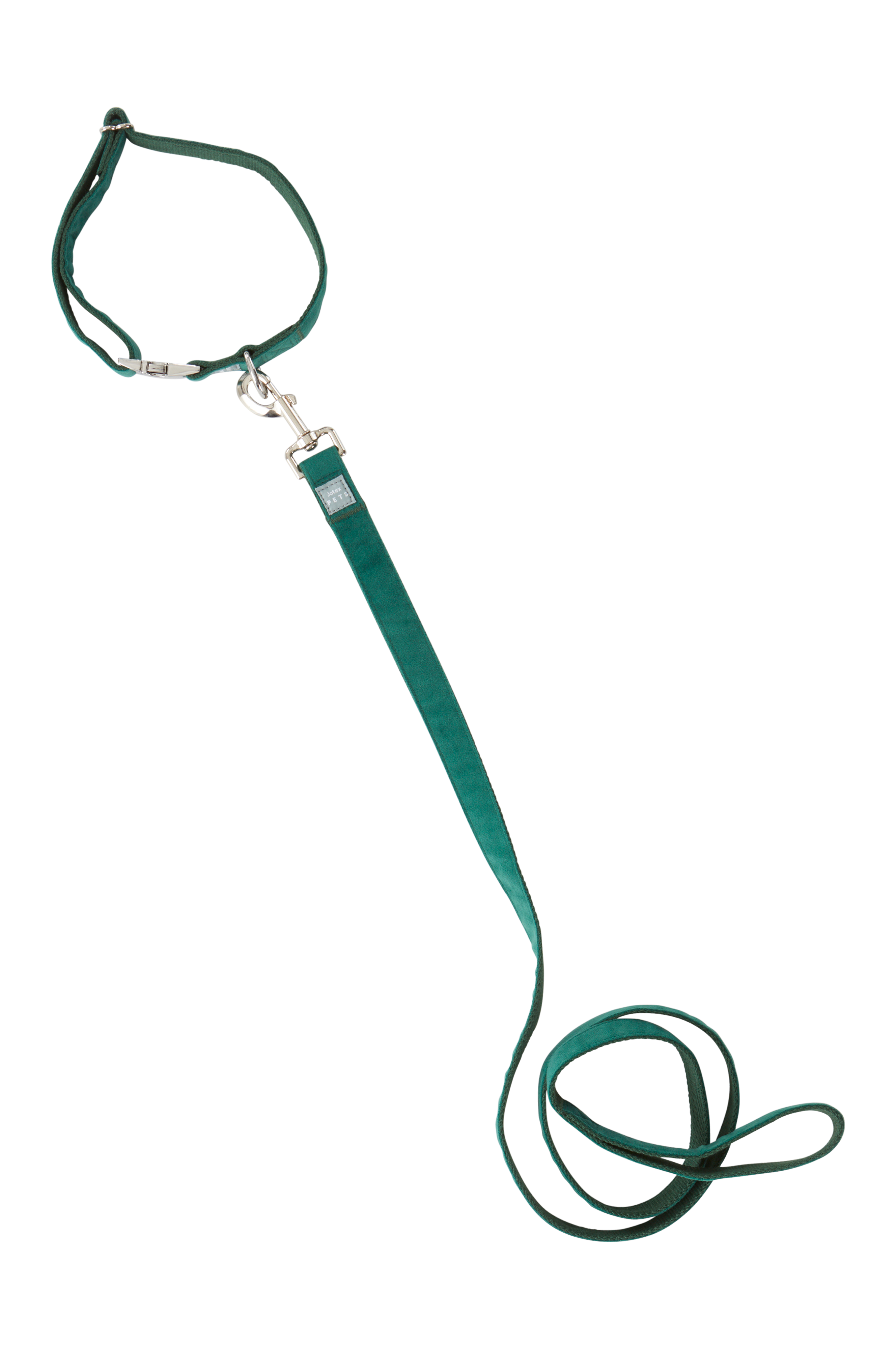 Halsbåndet er mykt og smidig, og har hurtigspensel av sølvfarget metall og halvring til å feste båndet i. Halsbåndets lengde er justerbar. Kobbelet har håndløkke i den ene enden og krok av sølvfarget metall til å feste i halsbåndet i den andre enden.