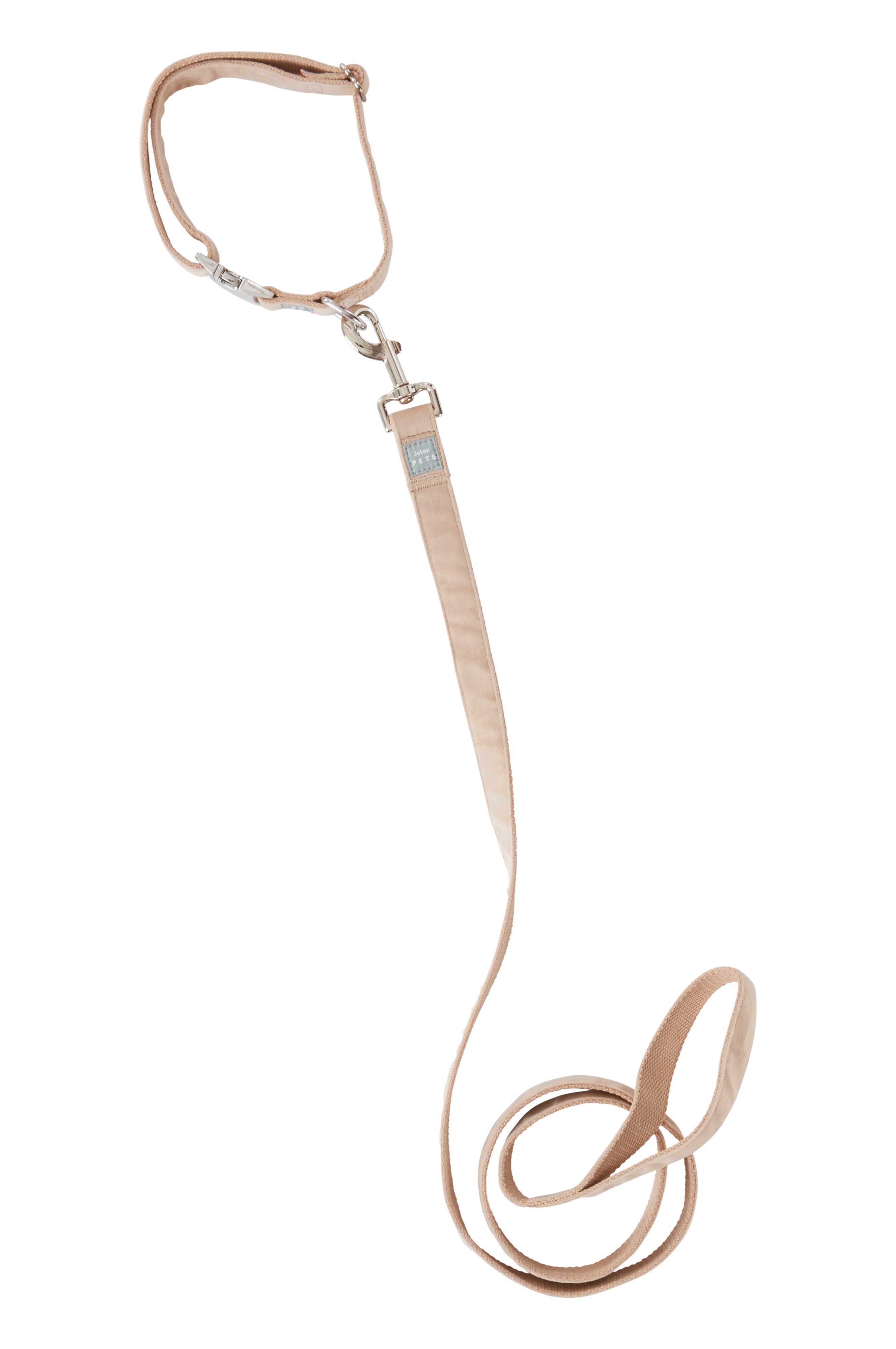Sett med halsbånd og kobbel av polyester - utmerket til hunder og kan også passe fint til en katt. Både kobbel og halsbånd har fløyel på utsiden og vevd, litt grovt bånd på innsiden.