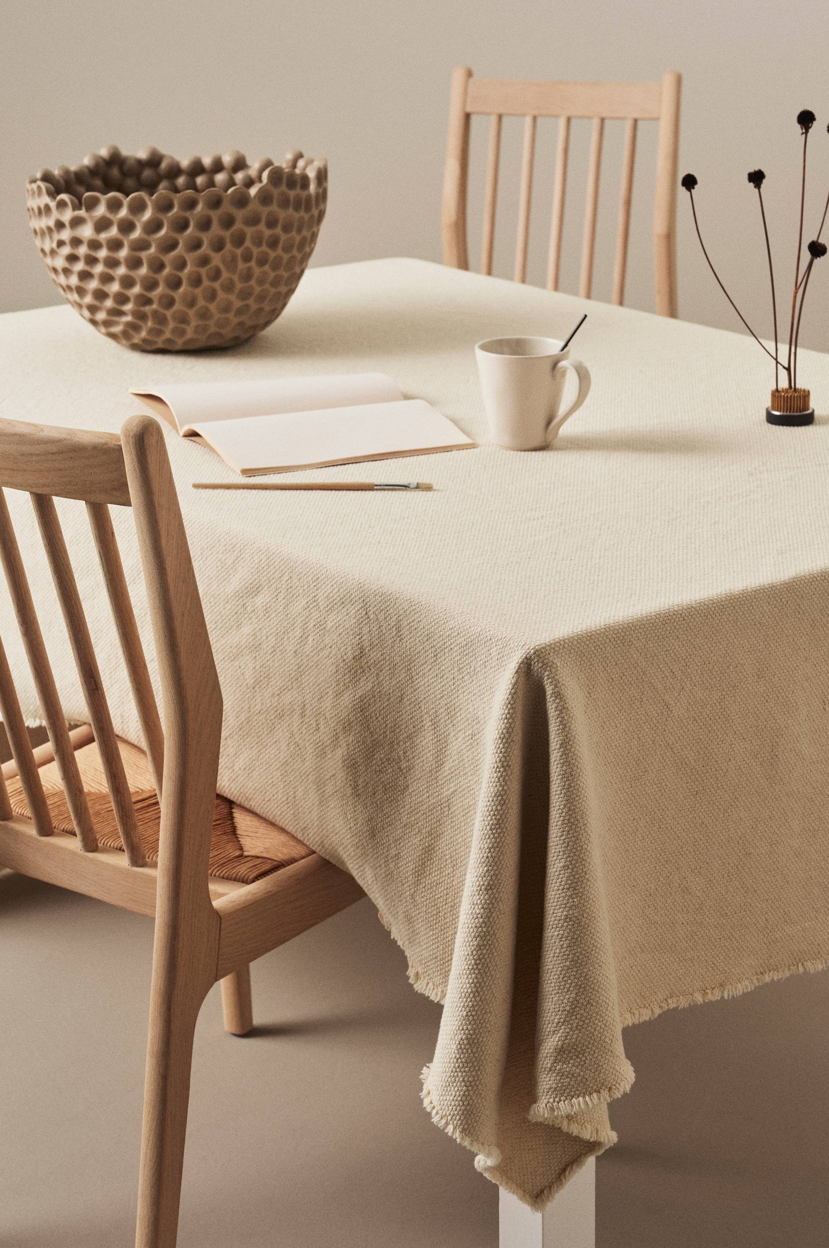 Duk av bomull som vevd i et litt grovt stoff. Duken har rå frynsekant rundt. Stoffet gir en rustikk følelse, og passer både landlige stiler og i moderne hvor det kan skape kontrast. Stoffet er plaggvasket. Det betyr at det er vasket før søm slik at kvaliteten blir ekstra behagelig og myk.