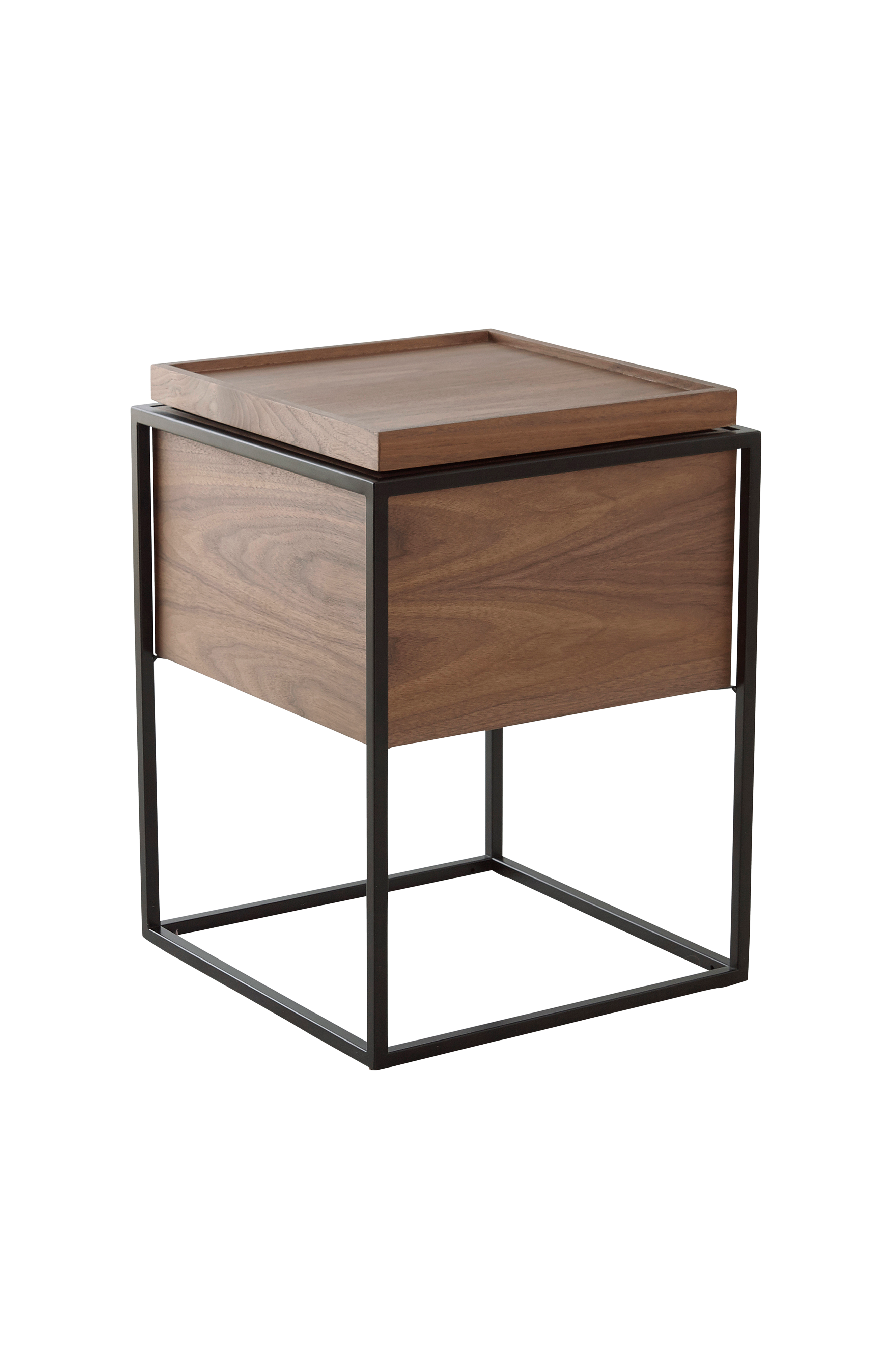 Beskrivelse: Firkantet sidebord med oppbevaring av finert mdf og metallramme.