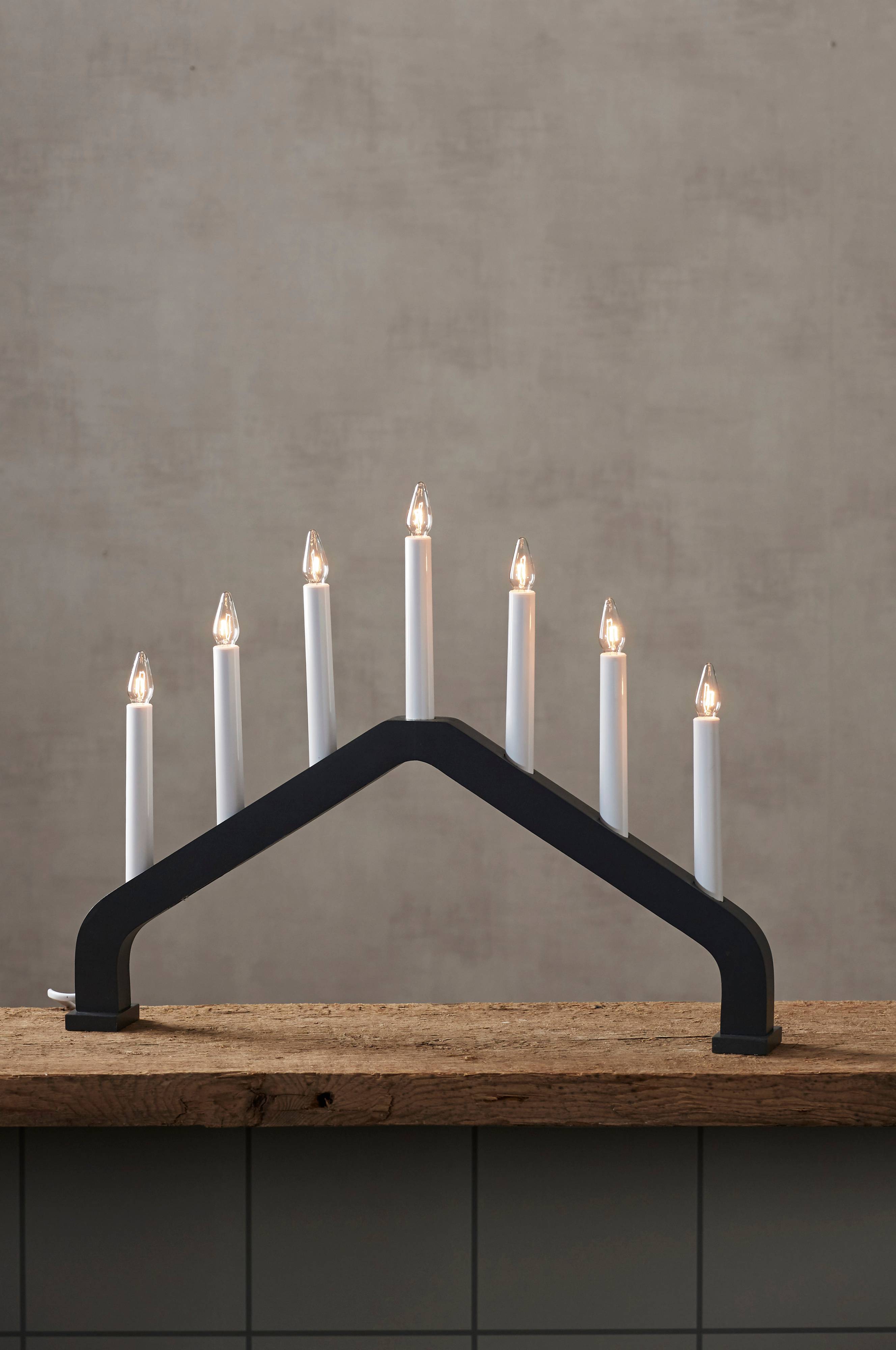 Lysestake i tre i stilren og enkel form for innendørsbruk med syv lys. Lyspære inkludert. Dybde:6 cm, høyde:37 cm, bredde:48 cm.