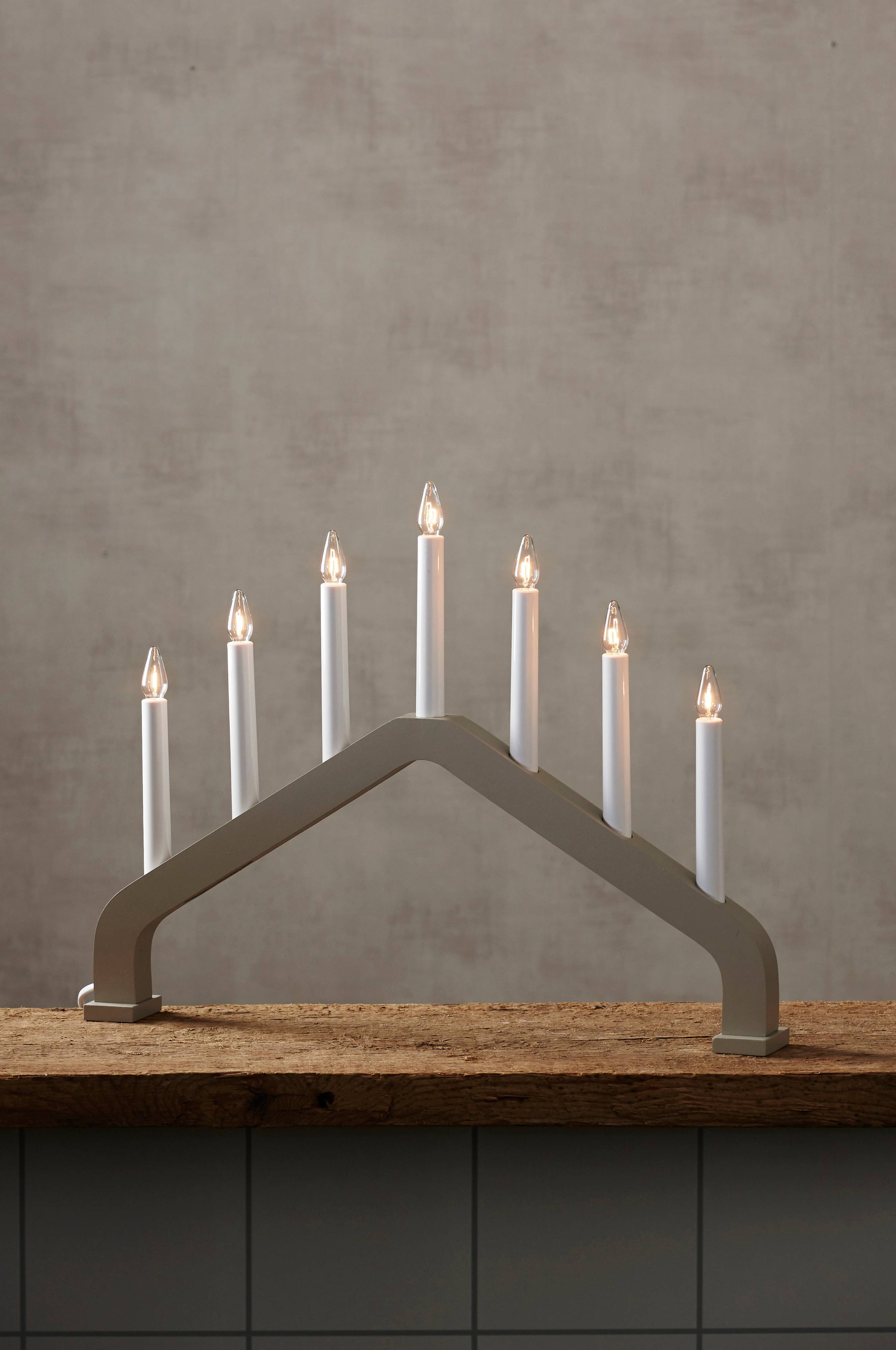 Lysestake i tre i stilren og enkel form for innendørsbruk med syv lys. Lyspære inkludert. Dybde:6 cm, høyde:37 cm, bredde:48 cm.