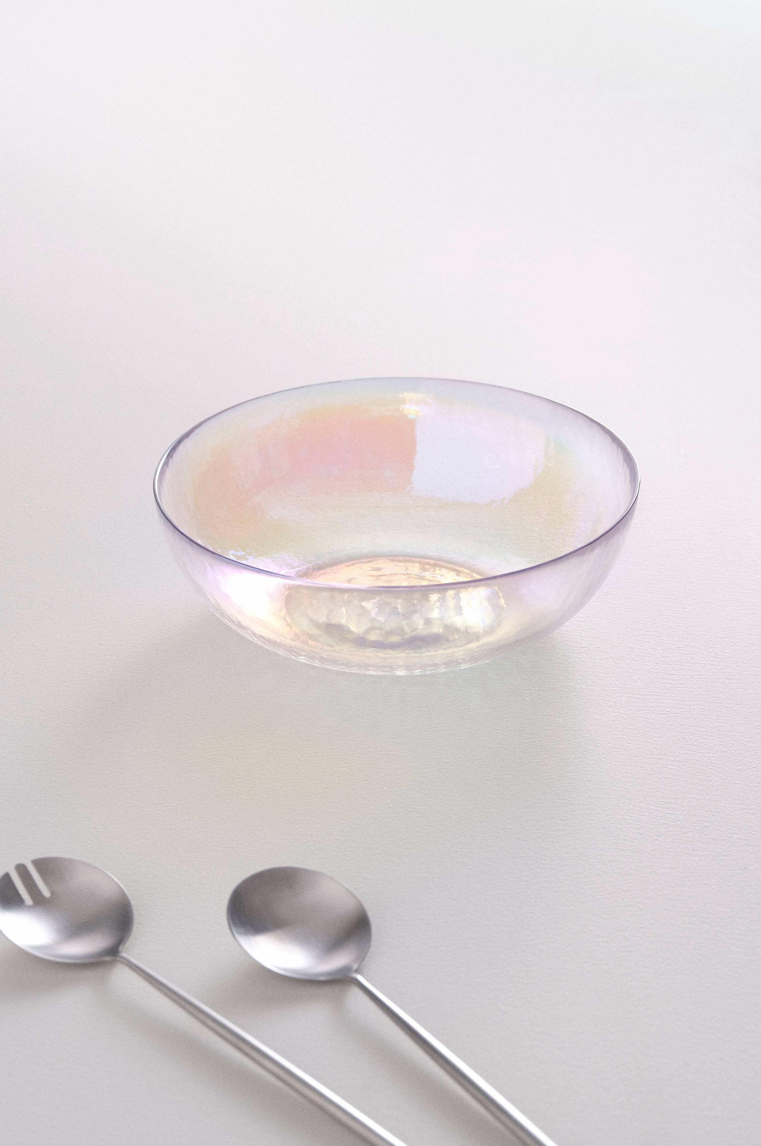 Bolle av glass med dekorativ uregelmessighet som reflekterer et vakkert fargespekter. Bollen er mykt avrundet i formen, og du kan servere alt fra en frisk salat til popkorn eller dessert i bollen. Alt ser appetittlig og godt ut.