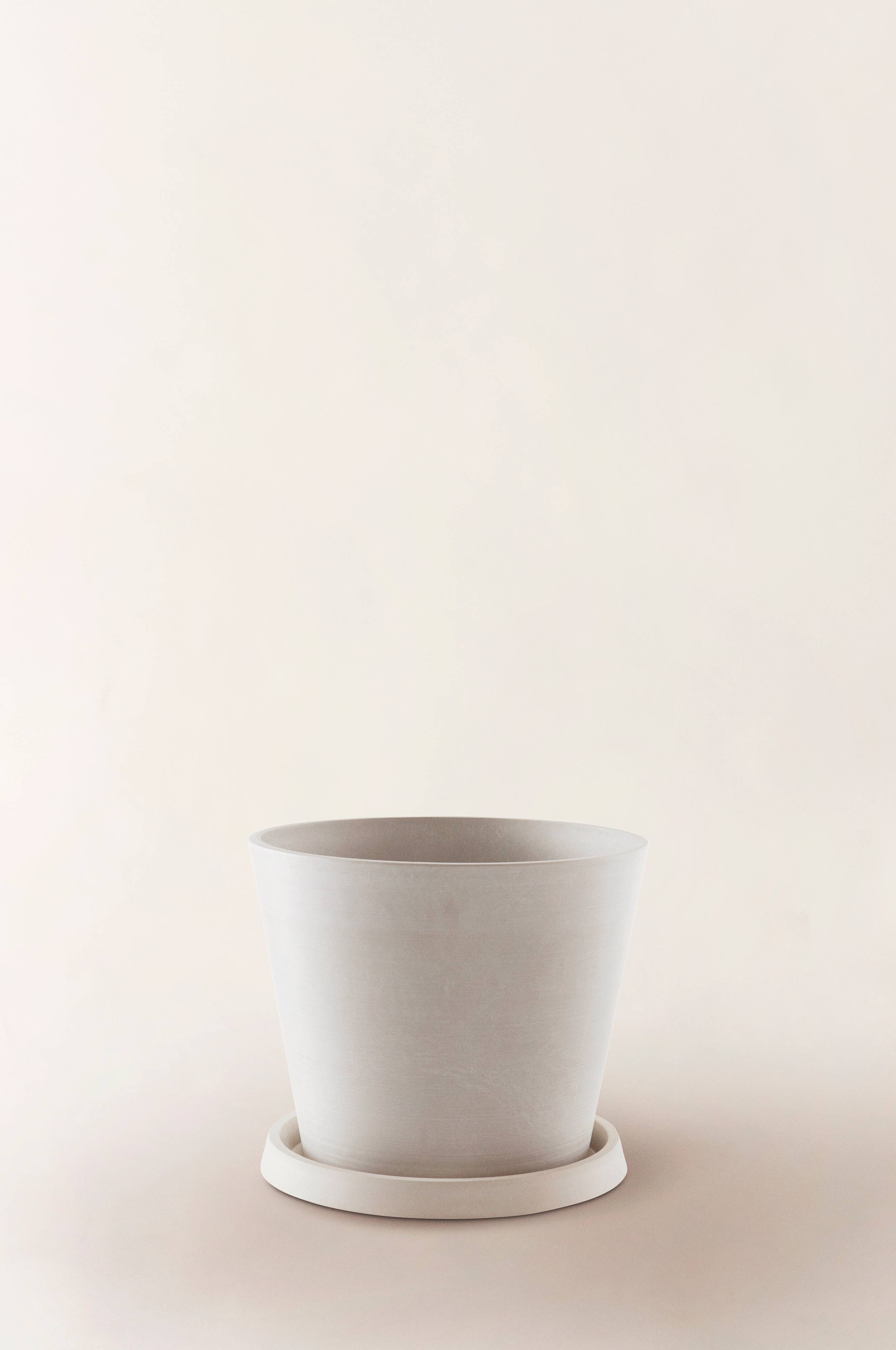 Potte og fat i en rett, stilren modell i et svært lett og slitesterkt materiale som fungerer både inne og ute. Potten og fatet er vær- og frostbestandige, de blekner ikke i sollys og er dessuten resirkulerbare.