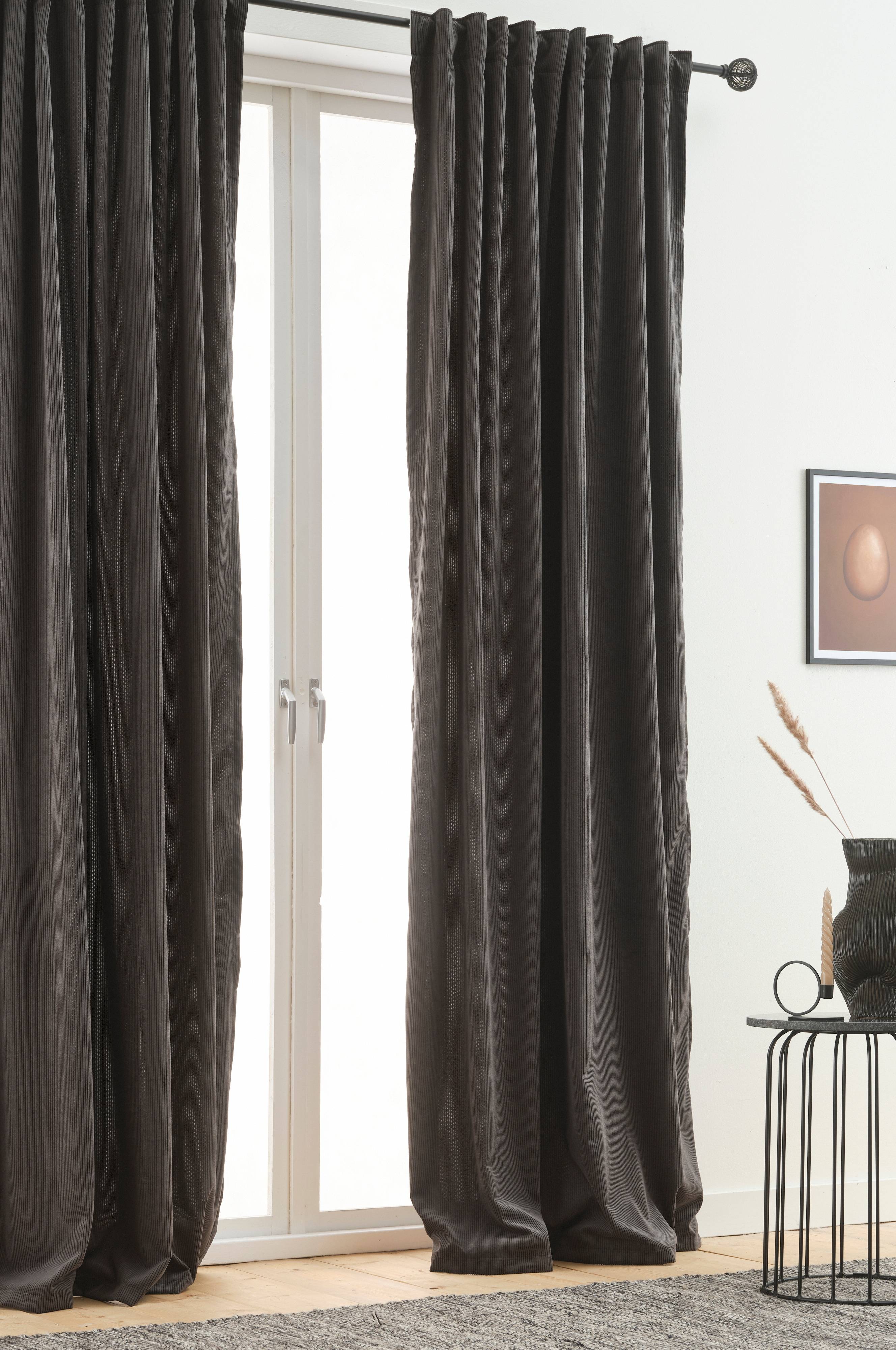 To gardinlengder i bredsporet kordfløyel med påsydd multifunksjonsbånd. Kordfløyel er en sann klassiker med herlig retrofølelse, et stoff som varer over tid. MANNI kommer i herlig milde farger som er lette å matche. Gardinen kan henges opp med fingerkroker, kanal samt skjulte hemper.
