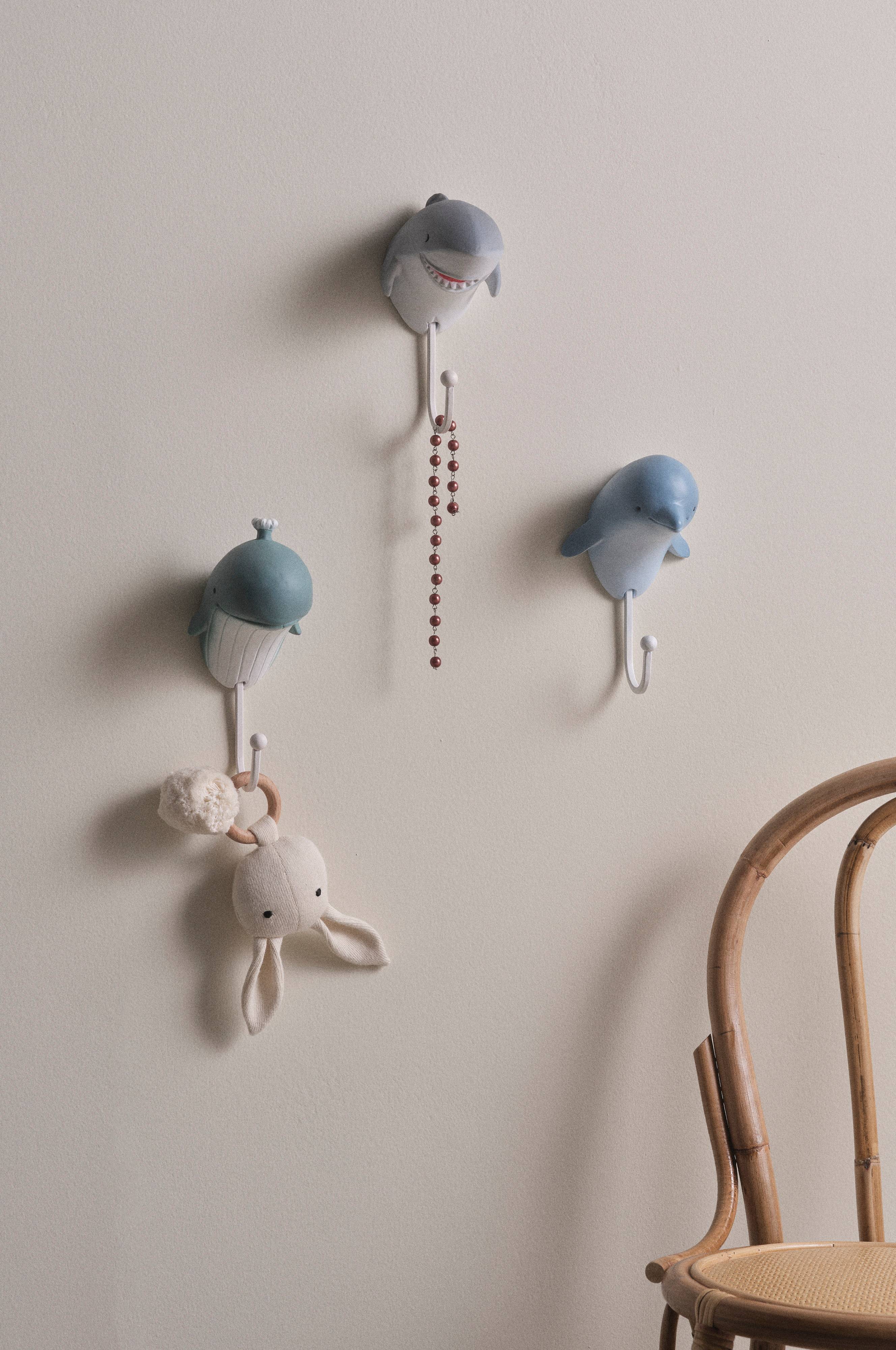 3-pk kroker som er håndlaget av dolomittporselen og kalkstein med knagg av jern. Dyrene er malte i fine farger med matt overflate. En hai, en hval og en delfin danner en fin trio på veggen, og det blir morsomt å henge opp klærne sine. Den kraftig bøyde knaggen gjør at det du henger opp blir hengende, en herlig detalj. Krokene har skjult veggmontering.
