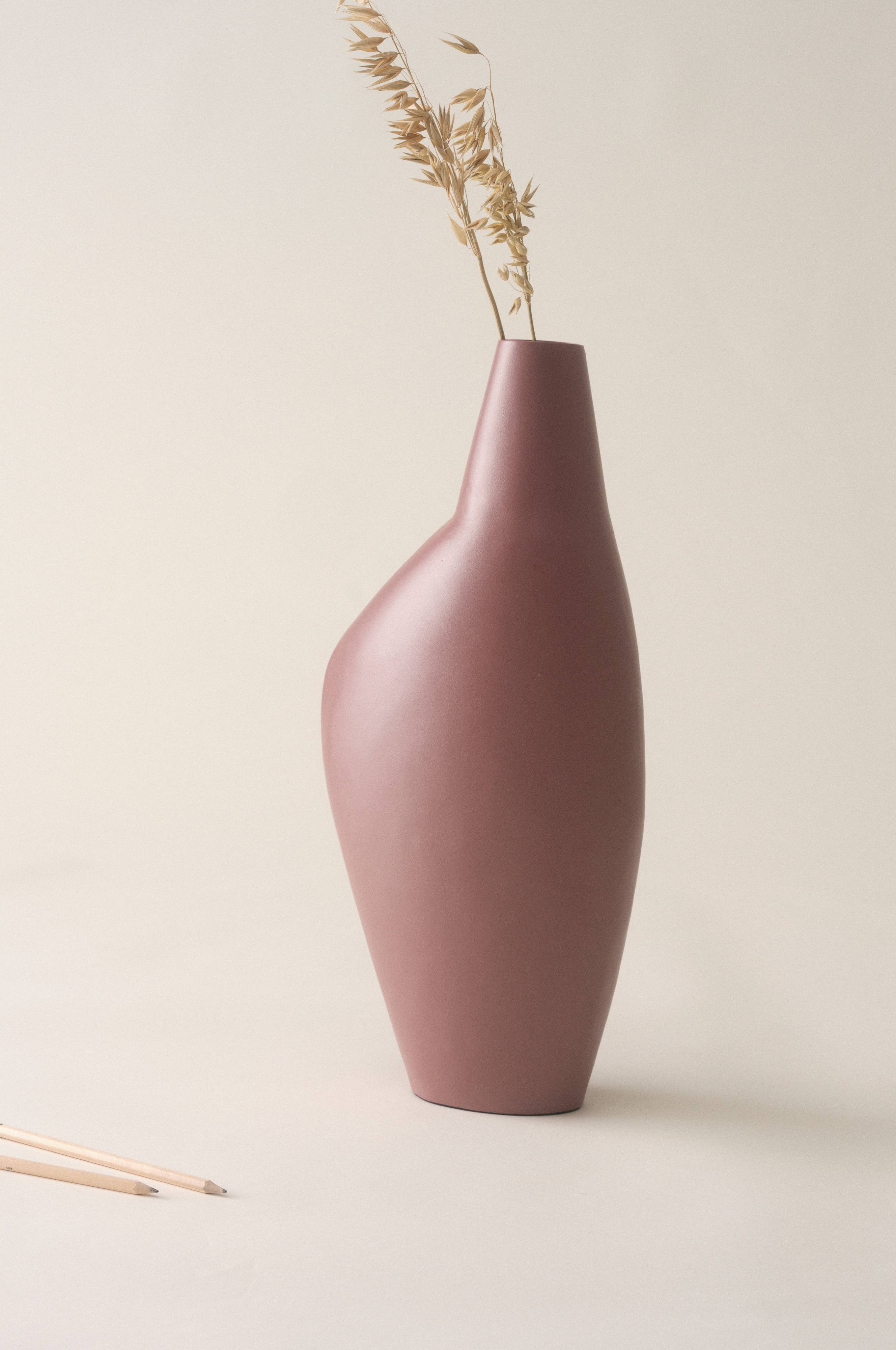 Vase av jern med matt overflate og myk fasong. Vasen er herlig asymmetrisk, og den smale åpningen gjør den vakker til få, høye blomster eller kvister som står rett uten å falle mot siden. Den milde, naturlige fargen gir fokus til vasens innhold.