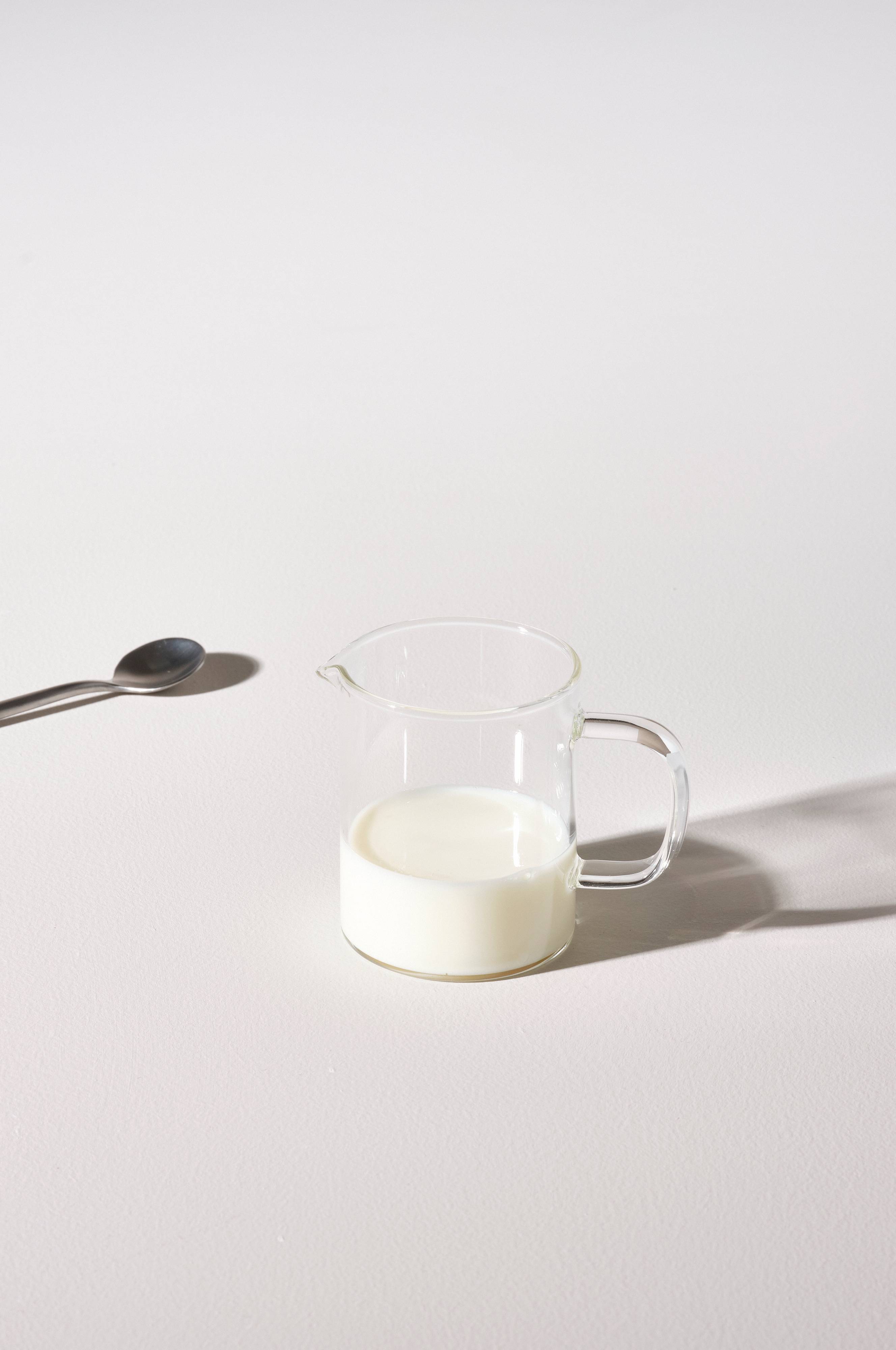Melkemugge i glass med håndtak. Trygg å bruke til mat. En moderne og stilren mugge som kan brukes både til varm og kald drikke. Rommer opptil 0,21 liter.