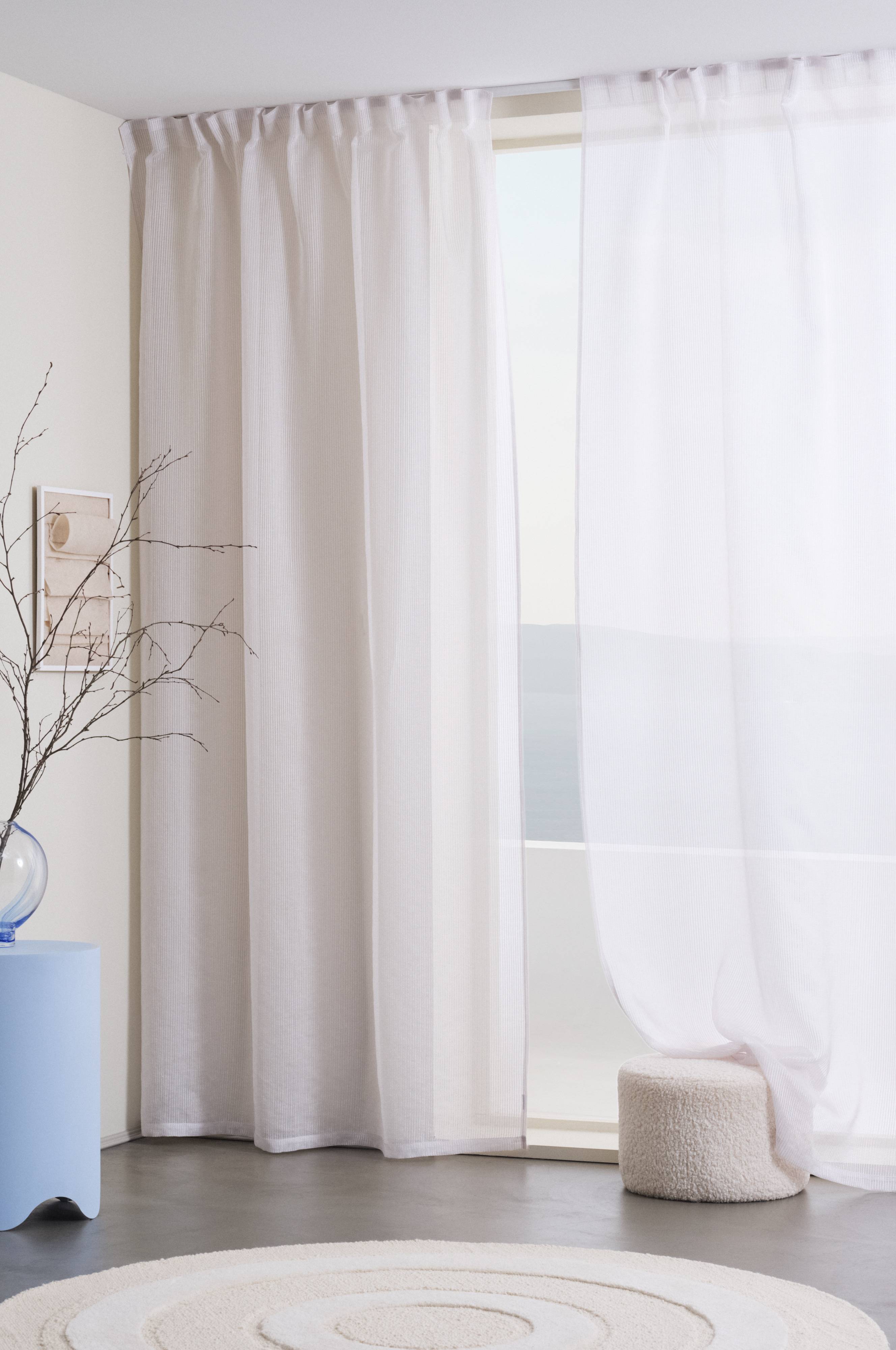 To gardinlengder i fin kvalitet av polyester med pent fall. Stoffet er vevd litt tynt, og de diskre stripene skyldes at en blank, noe tykkere tråd er vevd inn. Gardinlengden har påsydd multifunksjonsbånd, og kan henges opp med fingerkroker, kanal og skjult hempe. Fald nederst på 3 cm.