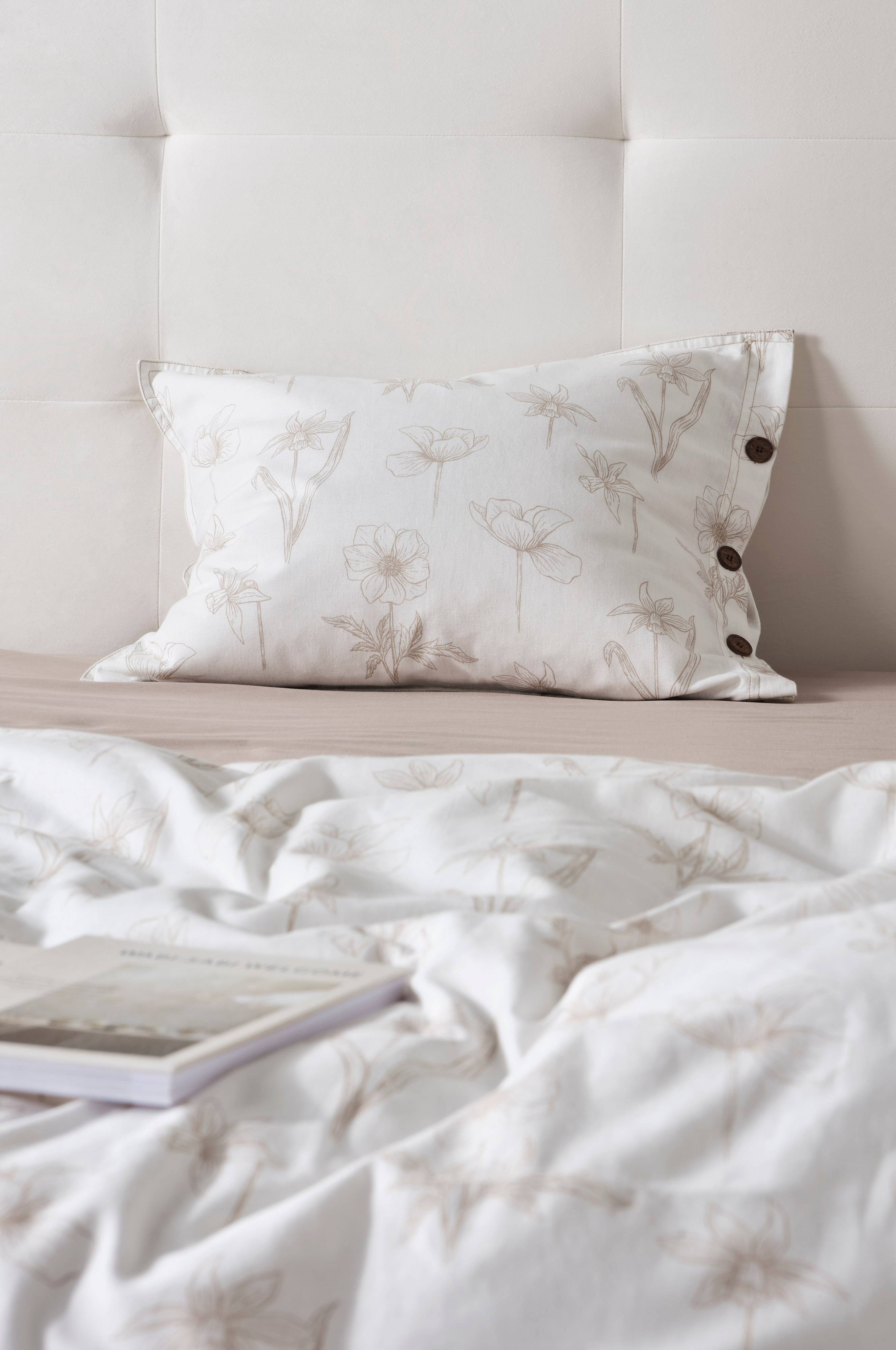 1-pk putevar i fin kvalitet av bomull og lin. Den deilige kvaliteten forener bomullens mykhet med linets naturlige varme. Stoffet er vasket for å bli ekstra komfortabelt. MEADOW er vendbart og har lett blomstertrykk med herlig vårfølelse på den ene siden, den andre siden er ensfarget. Putevaret har dobbeltsøm rundt, og sømmene er dekorative i seg selv da de matcher fargen på trykket. Plastknapper som minner om tre for lukking. Trådtetthet på 80 tc. (Trådtettheten forteller om antallet tråder, thread counts, pr. kvadrattomme i et stoff. Jo høyere trådtetthet, desto høyere kvalitet. Unntaket er lin som ofte veves løsere for å få den riktige følelsen.)